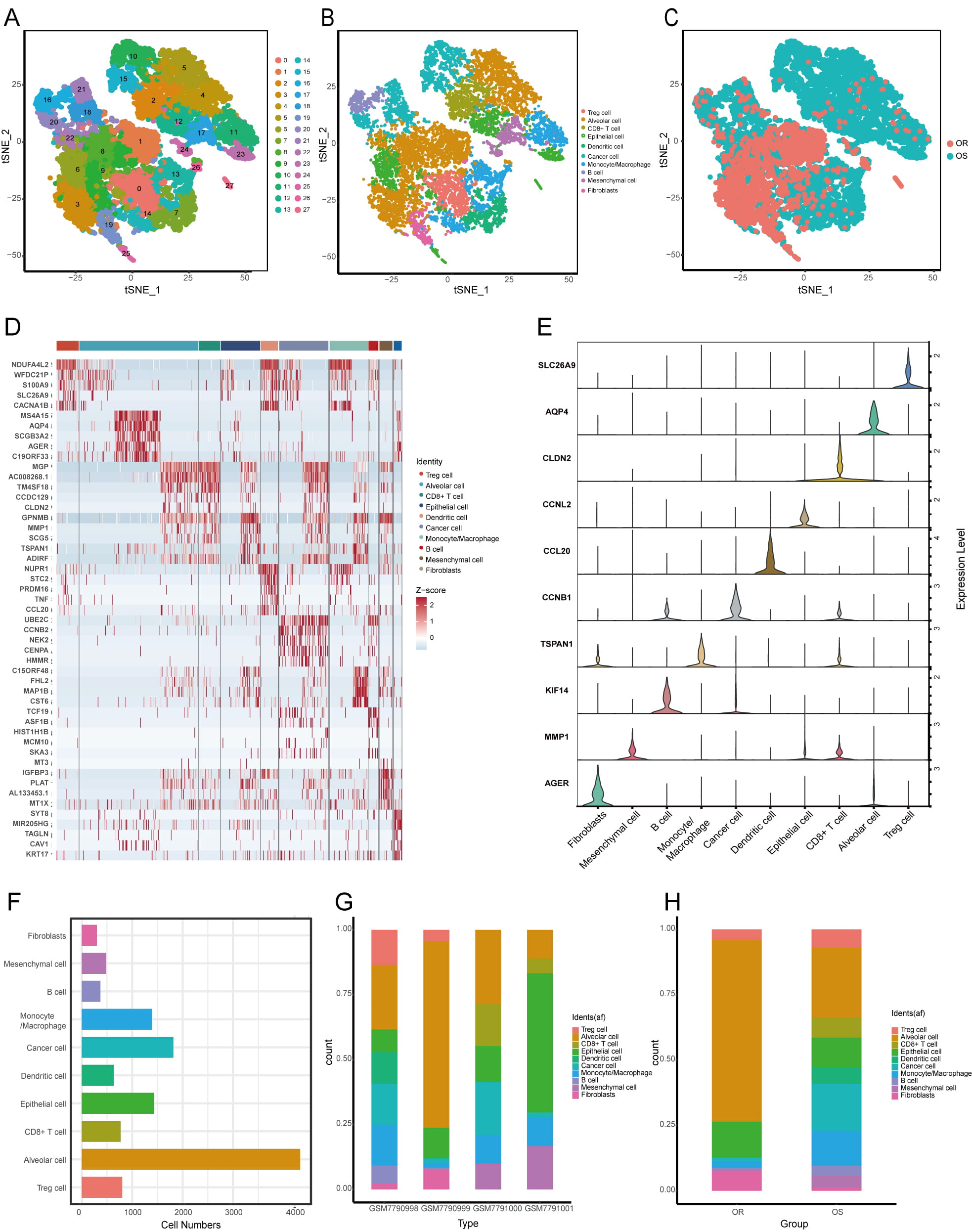 Fig. 2. Cell Populations in OS- and OR-LUAD tumor microenvironment (TME). (A) t-SNE projection of 27 distinct cell clusters. (B) t-SNE visualization color-coded by cell type. (C) t-SNE visualization color-coded by sample origin. (D) Heatmap illustrating differentially expressed marker genes (rows) across 10 distinct cell clusters. (E) Violin plots showing expression distribution of diagnostic marker genes per cell cluster. (F) The overall quantity of each cell type. (G) Cellular cluster distribution across four PDX samples. (H) Proportion of cell populations in the OS and OR sample groups. t-SNE, t-distributed stochastic neighbor embedding.