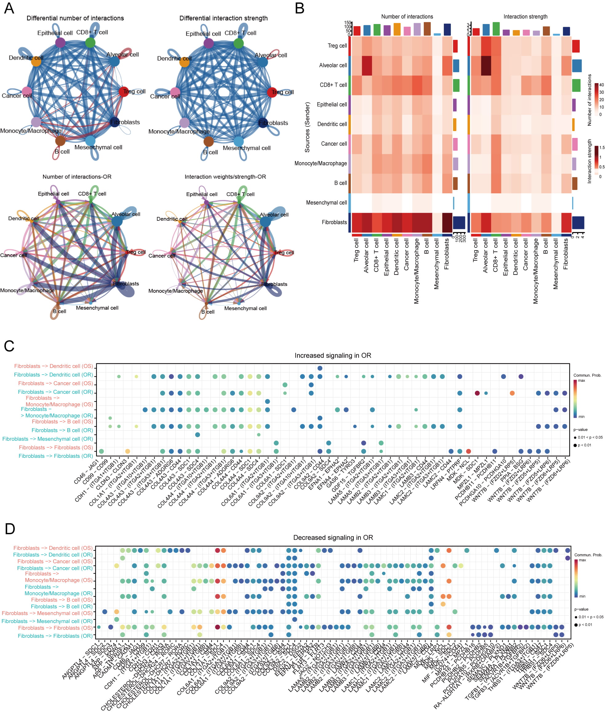 Fig. 3. Communication between cells within OR clusters. (A) Communication networks and interactions among different cell types in OS and OR samples; OS is shown in the top row, OR is shown in the bottom row. (B) Cell‒cell communication is illustrated through the number of interactions (left) and the strength of those interactions (right). The blue blocks indicate down-regulated interactions, whereas the red blocks indicate up-regulated communication within the OR group. (C,D) Alterations in the interaction networks of receptor‒ligand interactions between fibroblasts and various other cell types were observed in both the OS and OR groups. The Y-axis denotes the cell types, whereas the X-axis illustrates the receptor‒ligand pairs.