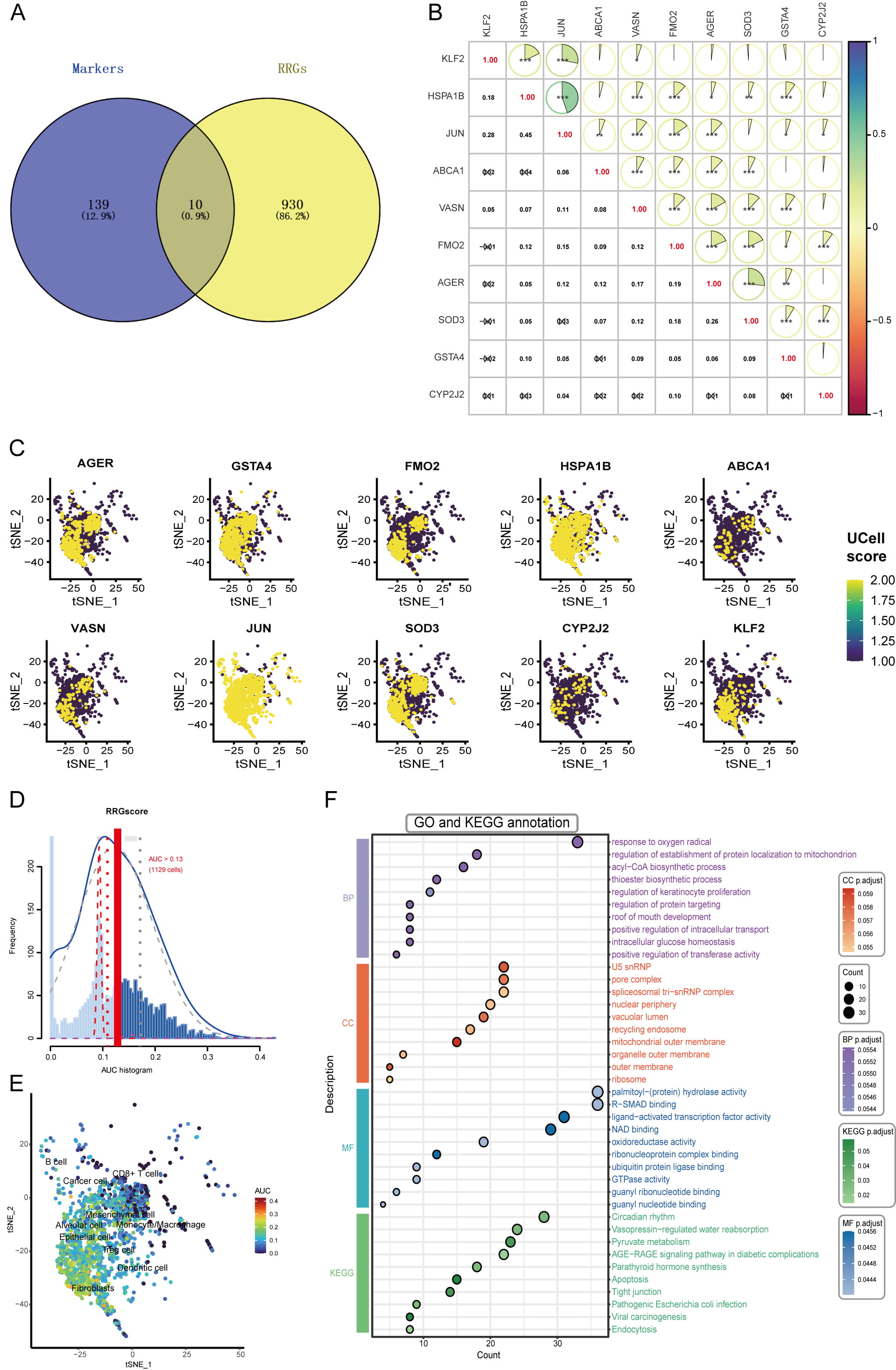 Fig. 4. Identification of DE-RRGs and scoring. (A) Venn diagram identifying DE-RRGs at the intersection of OR-specific markers and RRGs. (B) Correlation analysis of the 10 identified DE-RRGs, displaying pairwise correlation coefficients; *p