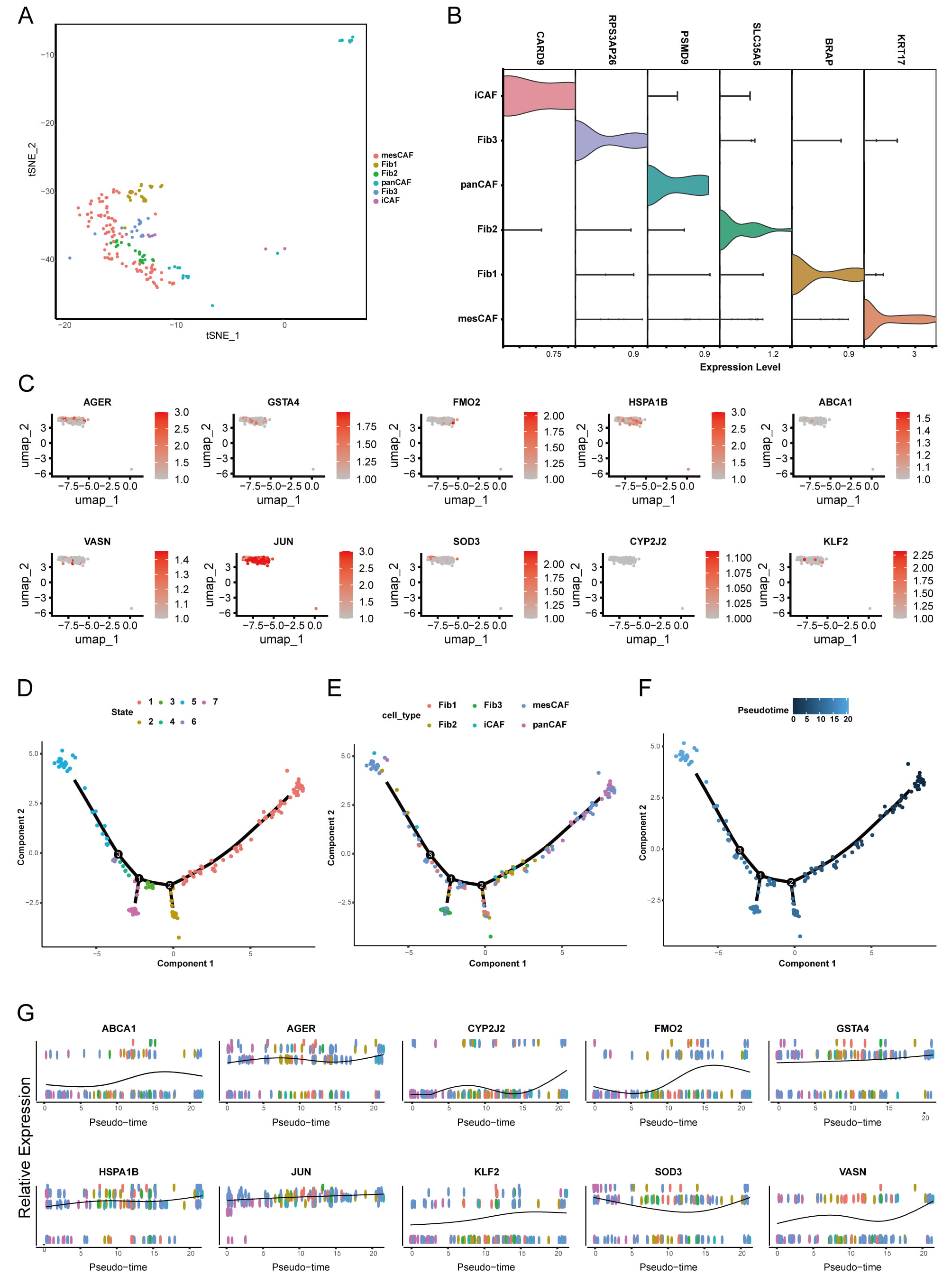 Fig. 5. Analysis of CAF subdivision and trajectory assessment. (A) t-SNE visualizations depicting 6 distinct subpopulations of fibroblasts in the OR group. (B) Violin plots illustrating the expression levels of cellular markers across 6 distinct CAF subpopulations. (C) UMAP plots of 10 DE-RRGs across 6 CAF subpopulations. (D–F) Differentiation trajectory of CAFs, represented by their state (D), cell type (E), and pseudotime (F). (G) The expression profiles of 10 DE-RRGs throughout the differentiation pseudotime trajectory. UMAP, Uniform Manifold Approximation and Projection.