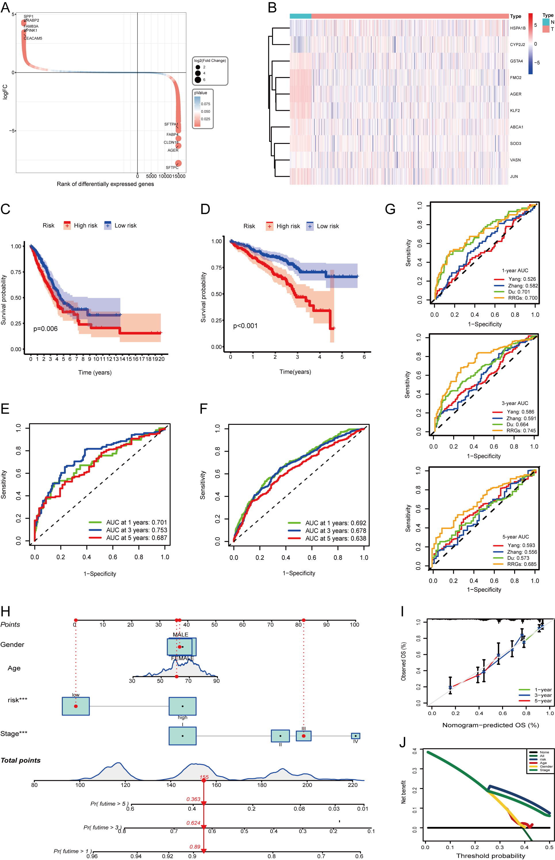 Fig. 6. Construction and validation of the prognostic risk model. (A) Evaluation of the DEGs between the normal and tumor groups. Each gene is represented by a circle, with its color indicating the level of significance regarding the differences in expression. (B) Heatmap illustrating the expression of 10 DE-RRGs between normal and tumor samples derived from the TCGA-LUAD cohort. (C,D) K‒M curves illustrating the survival outcomes of patients categorized into two risk groups within the TCGA-LUAD cohort (C) and GSE72094 cohort (D). (E,F) The ROC curves were constructed to evaluate the survival rates at 1-year, 3-year, and 5-year intervals for the TCGA-LUAD cohort (E) and GSE72094 cohort (F). (G) Comparison of time-dependent area under the ROC curve among prognostic signatures at 1-, 3-, and 5-years in the TCGA-LUAD dataset. (H) The specifics of the nomogram are provided. (I) A calibration curve was generated to predict overall survival at 1, 3, and 5 years. (J) Evaluation of risk scores accuracy via DCA curves. ROC, receiver operating characteristic; K-M, Kaplan-Meier; DCA, decision curve analysis.