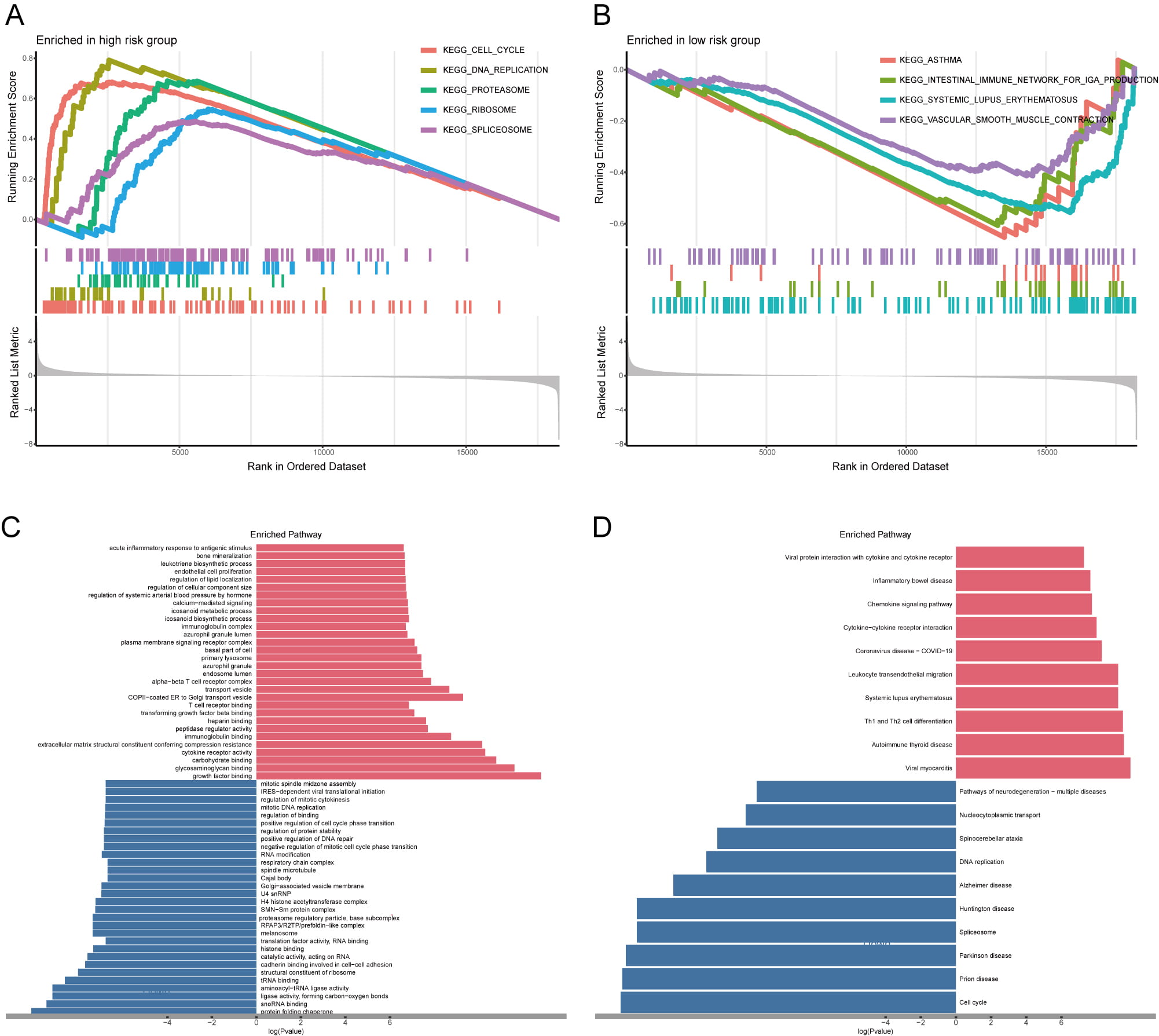 Fig. 7. Enrichment analysis of DEGs across two risk cohorts. (A,B) The GSEA analysis of DEGs between the high- (A) and low-risk cohorts (B). (C,D) GO (C) and KEGG (D) analyses; red color represents the pathway enrichment analysis for genes that are upregulated, whereas blue denotes the pathway enrichment analysis for downregulated genes. GSEA, gene set enrichment analysis.