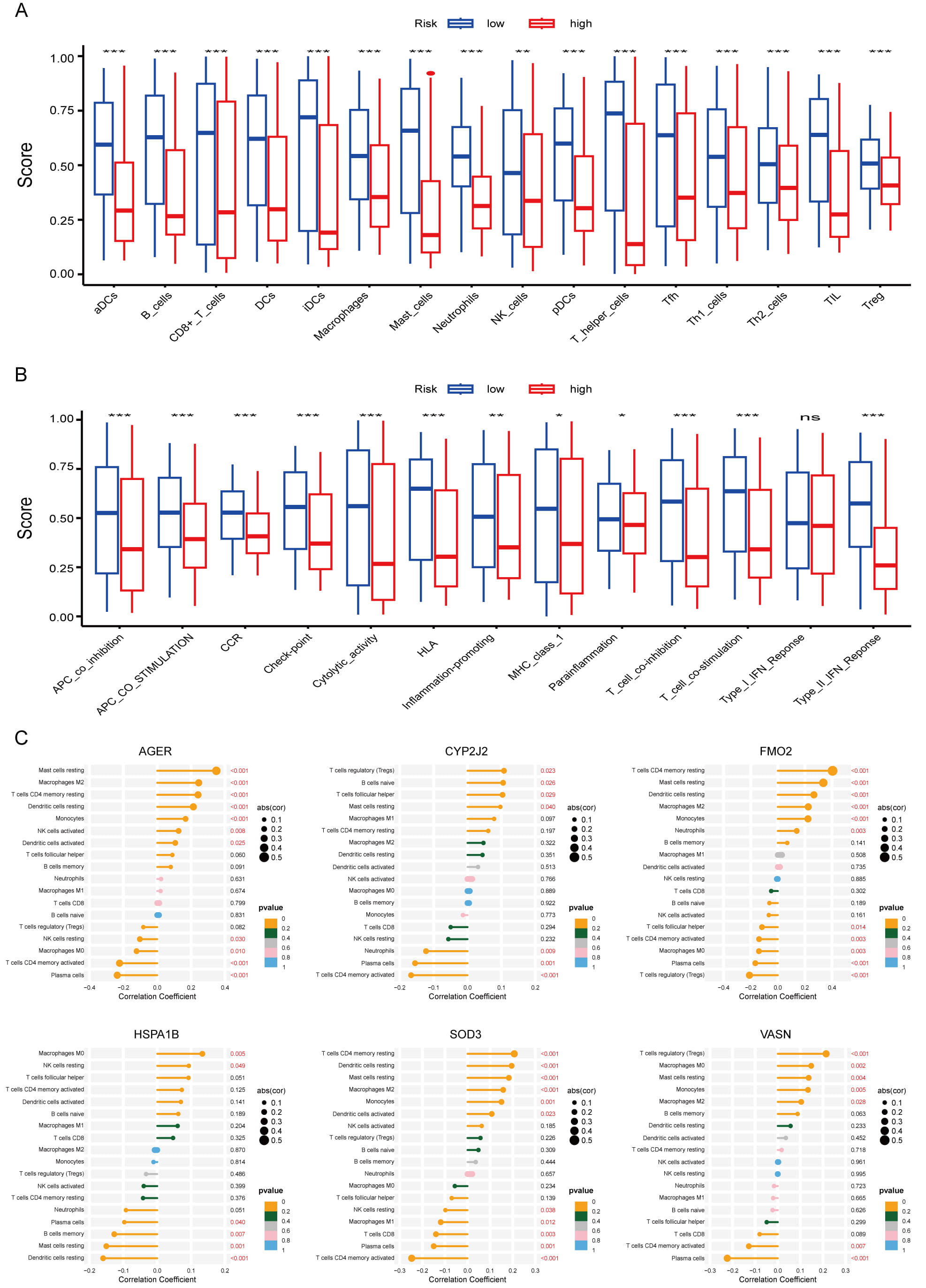 Fig. 8. Analysis of immune microenvironment in LUAD. (A,B) Differences in immune infiltration between the high- and low-risk cohorts; *p