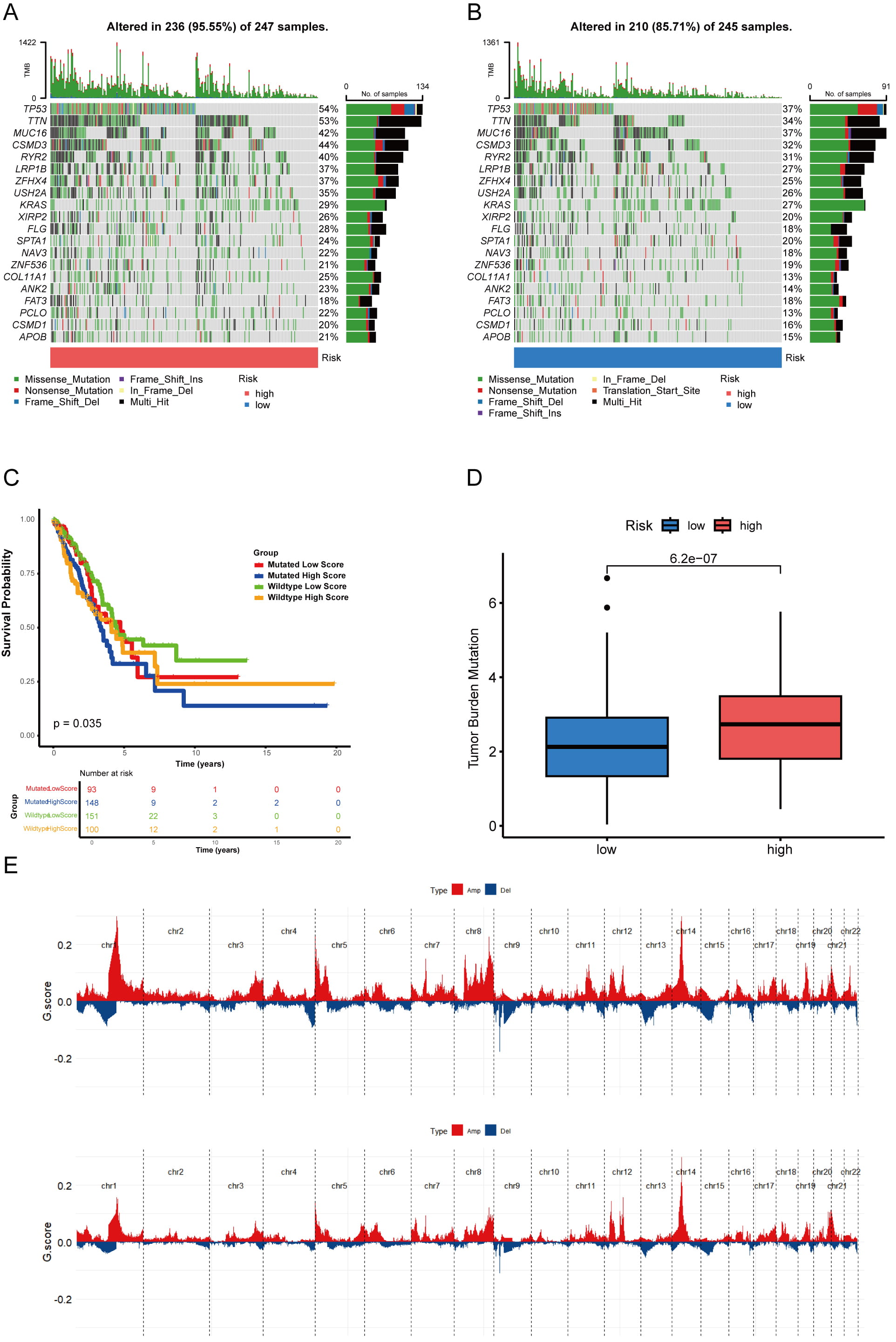Fig. 9. Analysis of gene mutations in LUAD. (A,B) A waterfall chart displaying somatic mutations in both the two risk cohorts. (C) K‒M curves for TCGA-LUAD patients based on the integration of risk scores and TP53 mutation. (D) Comparison of the TMB between groups categorized into two risk groups. (E) Analysis of copy number variations in two distinct risk groups; amplification mutations are indicated by red lines, whereas blue lines denote deletion mutations.
