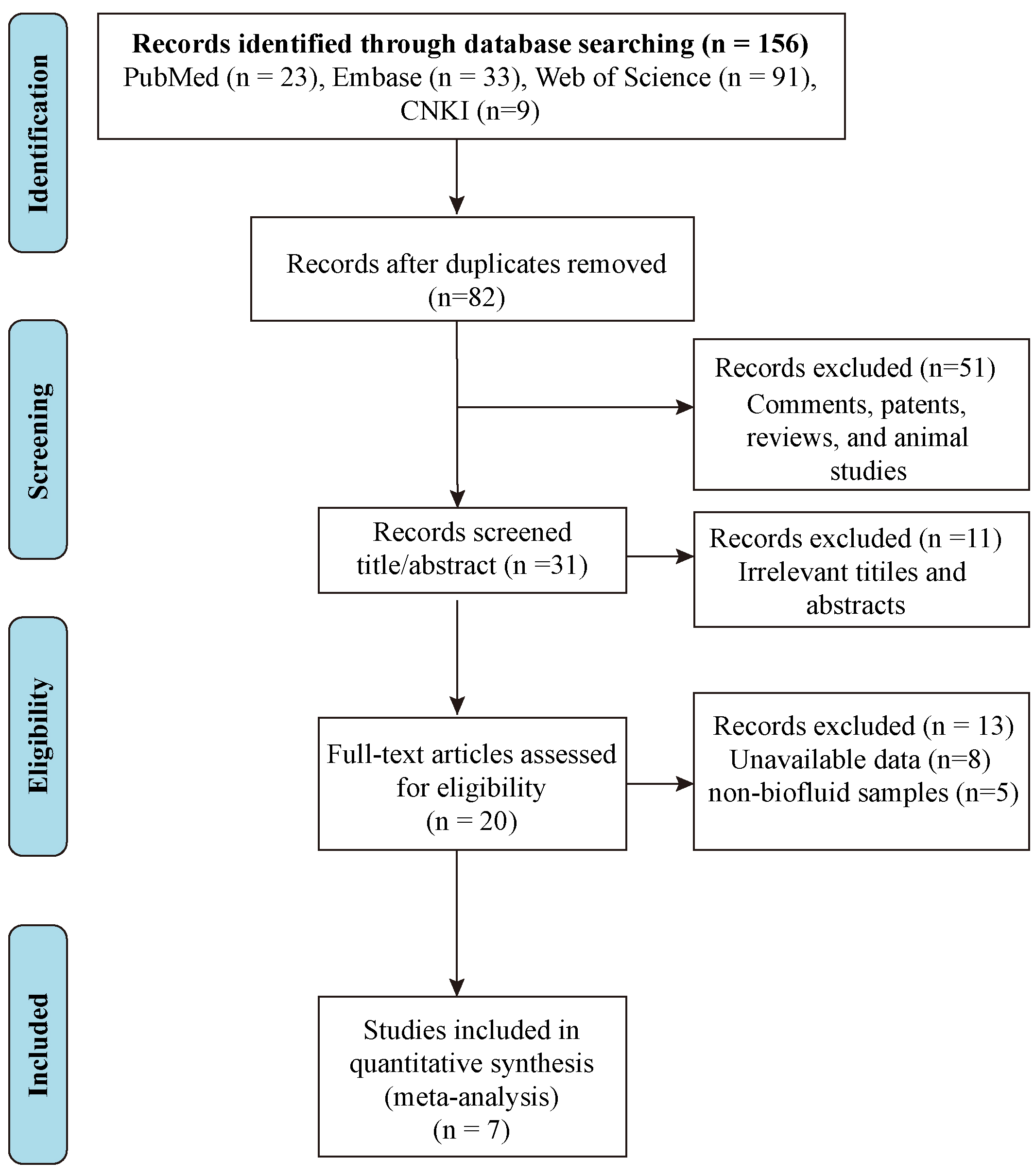 In total, 156 studies pertaining to CDO1 gene methylation in the context of lung cancer were initially identified from the electronic database. Following the exclusion of 74 duplicate records and 51 other types of publications (including comments, patents, reviews, and animal studies), the titles and abstracts of 31 publications were reviewed. Subsequently, 11 studies were excluded for failing to satisfy the predetermined inclusion criteria and the full texts of 20 articles were assessed for eligibility. Finally, after eliminating 13 studies for which data were unavailable or which were based on other sample sources, 7 relevant publications were selected for meta-analysis [26, 29, 30, 31, 32, 33, 34] (Fig. 1). The main characteristics of the seven studies are presented in Table 1 (Ref. [26, 29, 30, 31, 32, 33, 34]). In five studies, plasma was used for the detection of CDO1 promoter methylation, and urine and sputum were applied in the other three studies. With the exception of the investigations by Wang et al. [34] and Chen et al. [33], which employed quantitative polymerase chain reaction (qPCR), the remaining five studies utilized quantitative methylation-specific polymerase chain reaction (qMSP) to assess CDO1 promoter methylation status in biofluids [26, 29, 30, 31, 32].