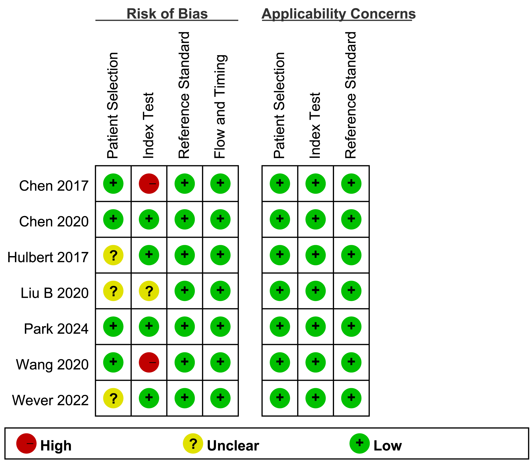 Quality assessment was performed using QUADAS-2 tool and the results are shown in Fig. 2. The risk of bias of the included studies was evaluated through patient selection, index test, reference standard, and flow and timing. Regarding the patient selection, three studies were assessed as “unclear” owing to lack of information on whether they enrolled consecutive patients and whether they avoided a case-control design. In the assessment of the index test, two studies received a “high risk” rating because their results were interpreted with prior knowledge of the reference standard’s outcomes. The risk of bias was deemed “unclear” for one study, as the publication omitted details on whether the index test was interpreted independently of the reference standard. For the reference standard and flow and timing, all studies were assessed as “low risk”. In summary, no major concerns regarding quality risk of the included studies were observed.