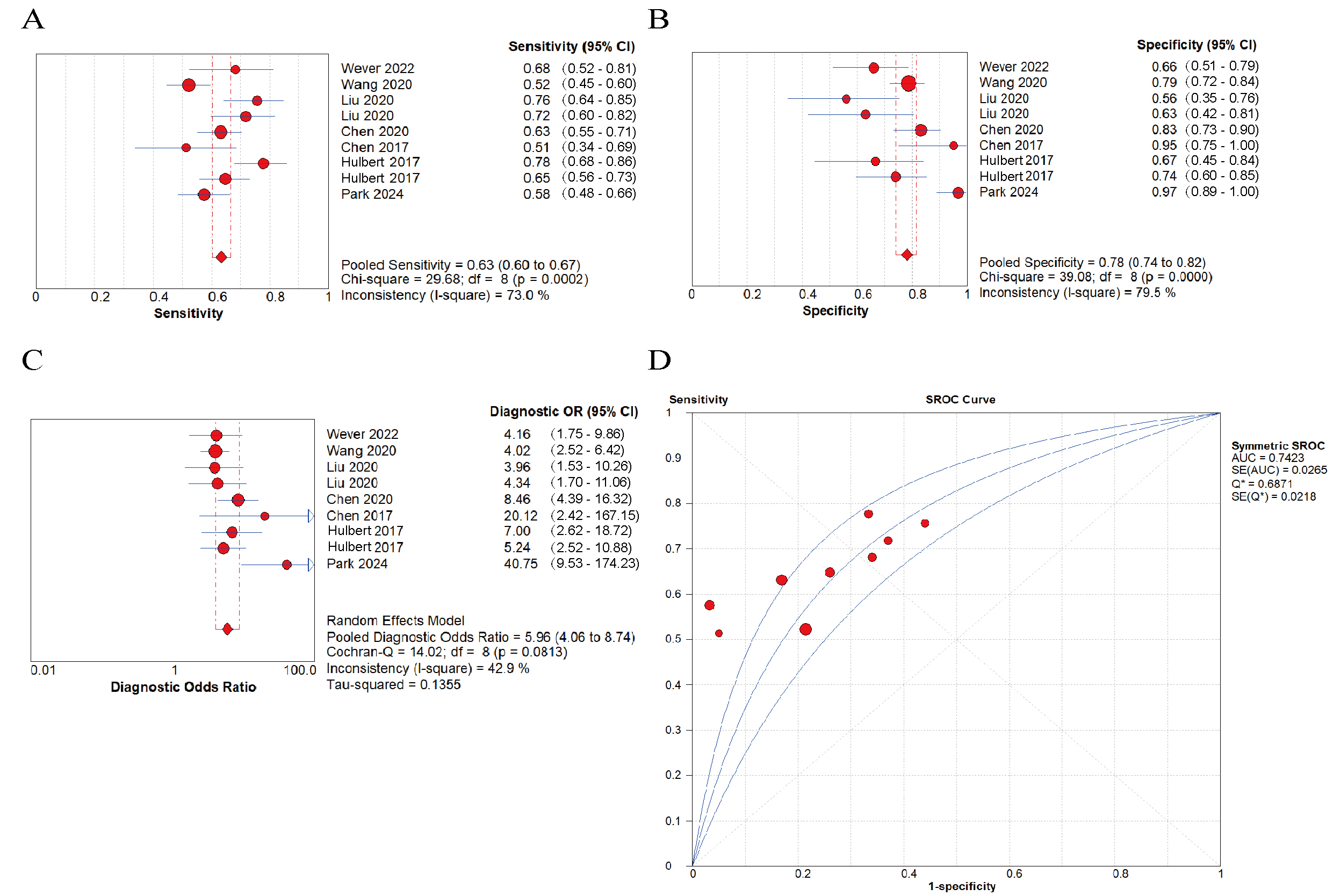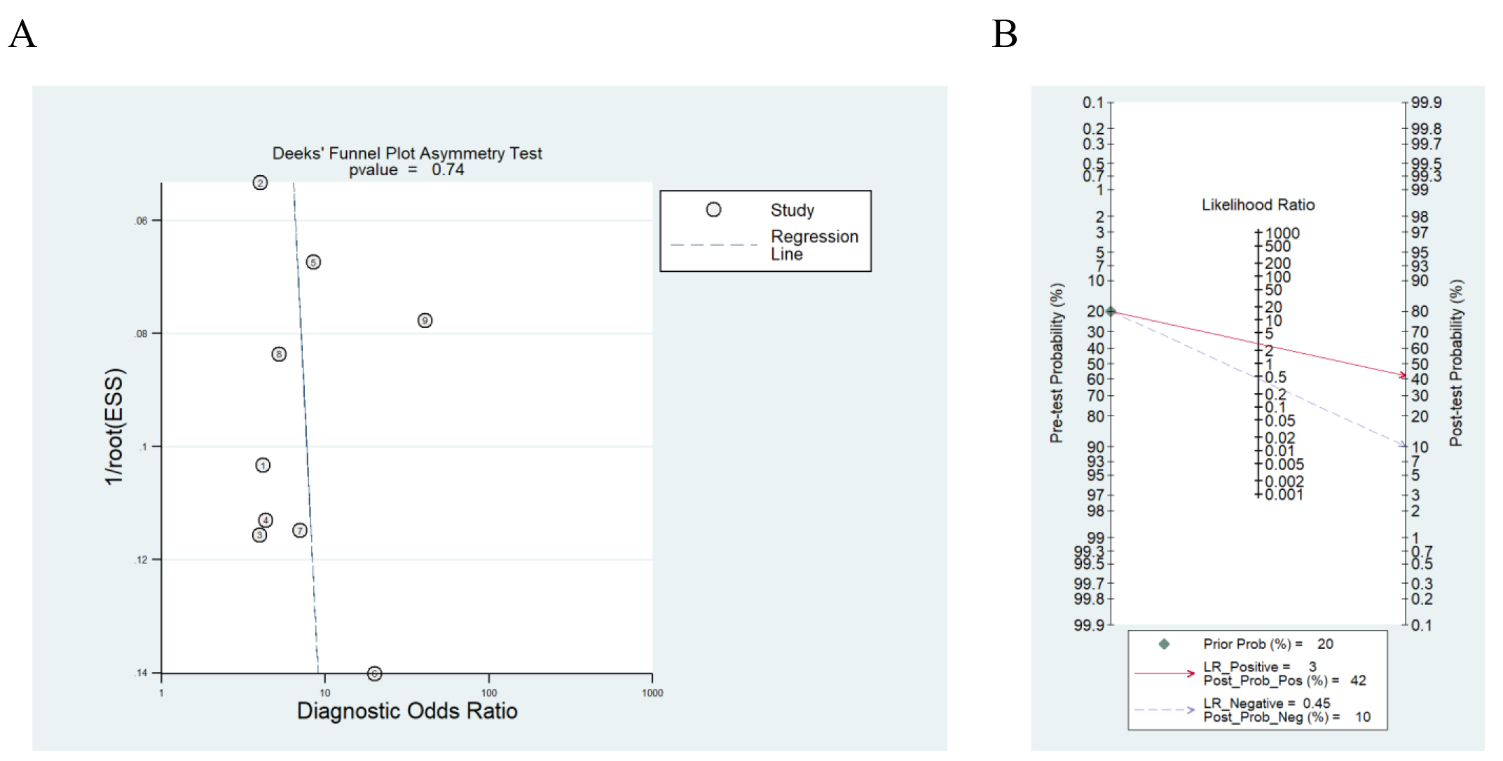Data up to June 5, 2025, across electronic databases (PubMed, Embase, Web of Science, and the China National Knowledge Infrastructure) were searched. The quality assessment tool for diagnostic accuracy studies-2 (QUADAS-2) checklist was used to assess the risk of bias in the incorporated studies. A random-effects model was employed to generate summary statistics for diagnostic accuracy, which included pooled sensitivity and specificity estimates, the diagnostic odds ratio (DOR), and a summary receiver operating characteristic curve. An exploration of heterogeneity sources was undertaken using meta-regression, followed by a sensitivity analysis to test the consistency of the results. Finally, Deek’s funnel plot was generated to estimate publication bias, and the clinical feasibility was evaluated using Fagan’s nomogram.
