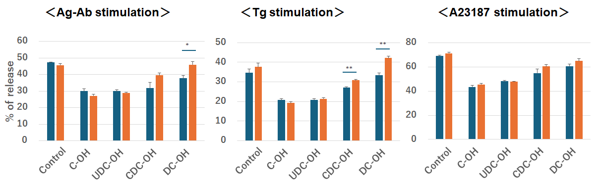 Initially, bile acids had hydrophilic and hydrophobic portions; therefore, they were amphipathic in nature. Taurine- and glycine-conjugated bile salts (TC, TCDC, TDC, GC, GCDC, and GDC) were more hydrophilic than unconjugated bile acids. However, they also had weak but significant inhibitory effects (10–37%) on the degranulation of stimulated RBL-2H3 cells with Ag-Ab and Tg (Supplementary Fig. 3).