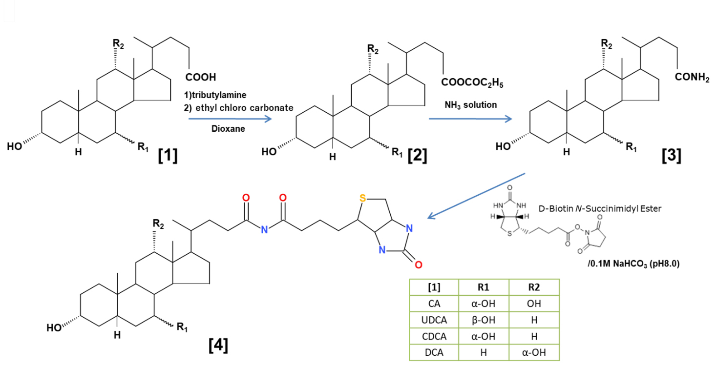 Fig. 2. The synthesis of bile acid-biotin derivatives. Synthesis route of biotinylated bile acid derivatives. Briefly, bile acids (CA, chenodeoxycholic acid (CDCA), ursodeoxycholic acid (UDCA), and deoxycholic acid (DCA)) [1] were reacted with ethyl chlorocarbonate in the presence of tributylamine ([1]