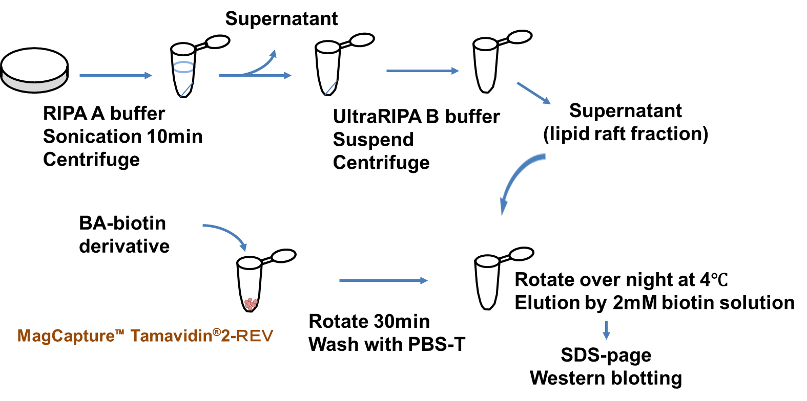 Fig. 3. Purification of binding protein to BA-biotin derivative by Tamavidin® 2-REV magnetic beads. Isolation of lipid raft fractions and analysis of proteins bound to biotinylated bile acid derivatives. Lipid rafts from rat basophilic leukemia (RBL-2H3) cell membranes were extracted under non-denaturing conditions using the ULTRARIPA® Kit. Biotinylated bile acid derivatives were incubated with MagCapture Tamavidin2-REV for 30 min. After washing three times with PBS containing 0.025% Tween-20, the MagCapture Tamavidin2-REV–bound bile acid derivatives were incubated with lipid raft fractions. Proteins bound to the steroidal nucleus were then analyzed by SDS-PAGE and western blotting. Detailed experimental procedures are provided in the Methods and Materials section.