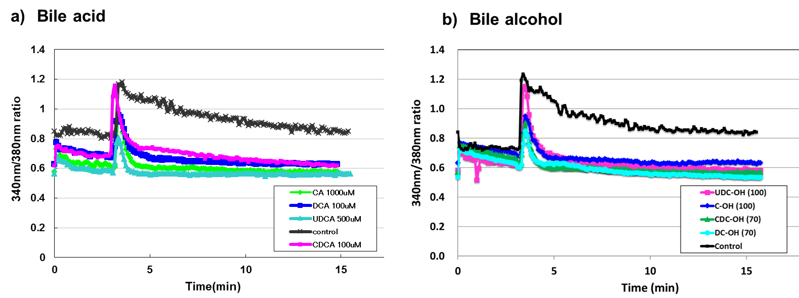 Taurine-conjugated CA (TC), taurine-conjugated UDCA (TUDC), taurine-conjugated CDCA (TCDC), taurine-conjugated DCA (TDC), glycine-conjugated CA (GC), glycine-conjugated UDCA (GUDC), glycine-conjugated CDCA (GCDC), and glycine-conjugated DCA (GDC) were provided by Dr. T. Hoshita (Hiroshima University, Hiroshima, Japan).
