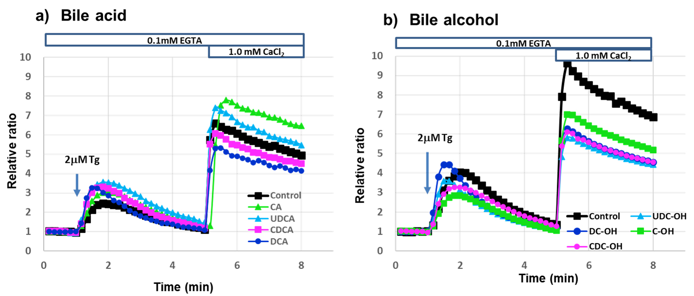Fig. 6. 1.0 mM Ca2+ Addition to RBL-2H3 cells stimulated with 2 µM Tg in Ca2+-free buffer increased [Ca2+]𝐢 with or without bile acid or bile alcohol. Time course of cytosolic Ca2+ concentration changes in RBL-2H3 cells treated with bile acids or bile alcohols and stimulated with thapsigargin (Tg). Treatment and Stimulation: Cells were treated with the indicated bile acids (a) or bile alcohols (b). In Ca2+-free extracellular solution, 2 µM Tg was added at 1 min to induce Ca2+ release from the endoplasmic reticulum, followed by addition of 1.0 mM Ca2+ at 5 min. Detection: Changes in fluorescence over time were monitored using a fluorescence microscope (BIOREVO 9000, Keyence, Osaka, Osaka, Japan). Data representation: (a) Bile acids: black, green, azure, pink, and mazarine lines represent control, CA 1000 µM, UDCA 500 µM, CDCA 100 µM, and DCA 100 µM, respectively. (b) Bile alcohols: black, green, azure, pink, and mazarine lines represent control, C-OH 100 µM, UDC-OH 100 µM, CDC-OH 70 µM, and DC-OH 70 µM, respectively. Detailed experimental procedures are provided in the Methods and Materials section.