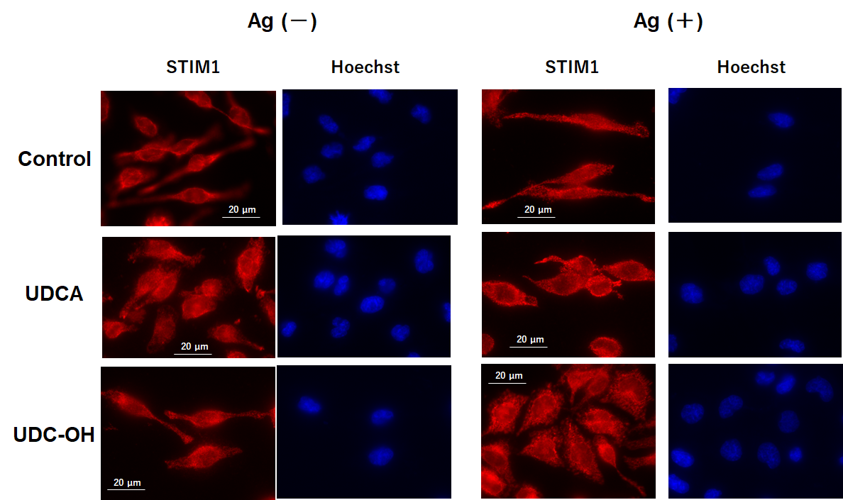 RBL-2H3 cells grown on glass coverslips were used for fluorescence staining. RBL-2H3 cells sensitized as mentioned earlier were washed twice with the prepared Siraganian buffer, pretreated with CA, UDCA, CDCA, DCA, C-OH, UDC-OH, CDC-OH or DC-OH for 10 min, and stimulated with Ag for 2.5 min. The cells were washed with PBS and fixed with 4% paraformaldehyde in PBS for 10 min at room temperature followed by washed three times with 10 mM Glycine-PBS for 3 min, permeabilized with 0.1% Triton X-100 for 5 min, washed three times again, blocked with 3% BSA–PBS for 10 min, and incubated with anti-STIM1 antibody (1:100) in 1% BSA–PBS overnight at 4 °C. After washing with 0.1% BSA–PBS four times for 3 min each, the cells were incubated with anti-rabbit IgG (H+L) Secondary Antibody, Alexa Fluor™ 594 (1:2000, Thermo Fisher Scientific, Waltham, MA, USA) and Hoechst33342 for 1 h at room temperature. After washing four times for 3 min each, the cells were mounted in mounting medium Moiwol 4-88 Reagent and prepared as a slide.