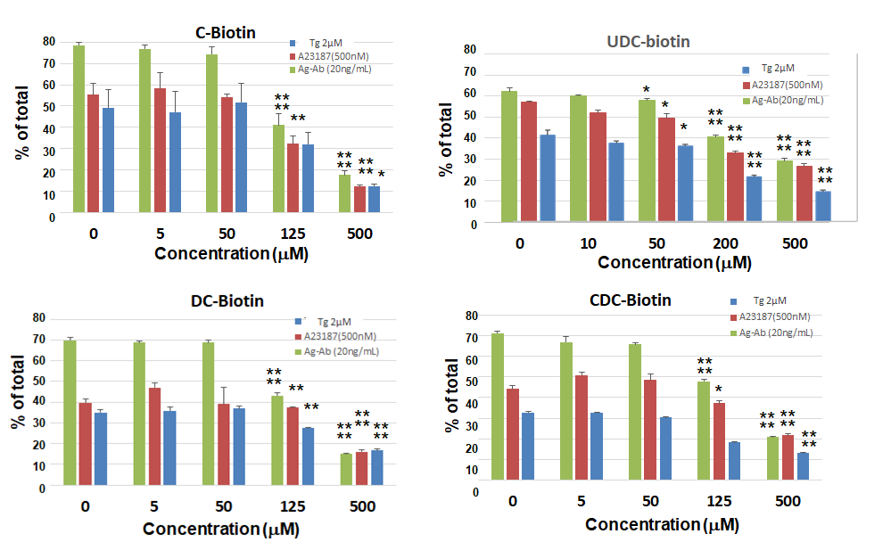 Fig. 8. Bile acid-biotin derivatives also inhibit histamine release. Degranulation assay of RBL-2H3 cells treated with biotinylated bile acid derivatives. Treatment and Stimulation: Sensitized cells were pretreated with C-biotin, UDC-biotin, CDC-biotin, or DC-biotin and stimulated with DNP-BSA (20 ng/mL). Non-sensitized cells were treated similarly and stimulated with Tg (2 µM) or A23187 (0.5 µM). Assay: