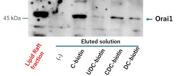 Orai1 protein exists in lipid rafts that form the CRAC channel. Fig. 3 shows a scheme for lipid raft fractionation and bile acid-binding lipid raft protein purification. The lipid raft and detergent-resistant membranes were solubilized with less degeneration using the ULTRARIPA B buffer from the ULTRARIPA® Kit for Lipid Raft, and the supernatant contained the lipid raft fraction after centrifugation. The supernatant was incubated with MagCapture™ Tamavidin®2-Rev, which binds to the bile acid biotin derivative via biotin overnight at 4 °C. Protein binding to the bile acid biotin derivative was eluted with a 0.2 M biotin solution (Fig. 3). Samples treated with bile acid derivatives showed a band of approximately 50 kDa. Therefore, an anti-Orai1 antibody was used for western blotting, and each derivative bound to Orai1, although the amount varied (Fig. 9). The binding of Orai1 to each bile acid derivative may induce bile acid and bile alcohol inhibitory effects on degranulation.