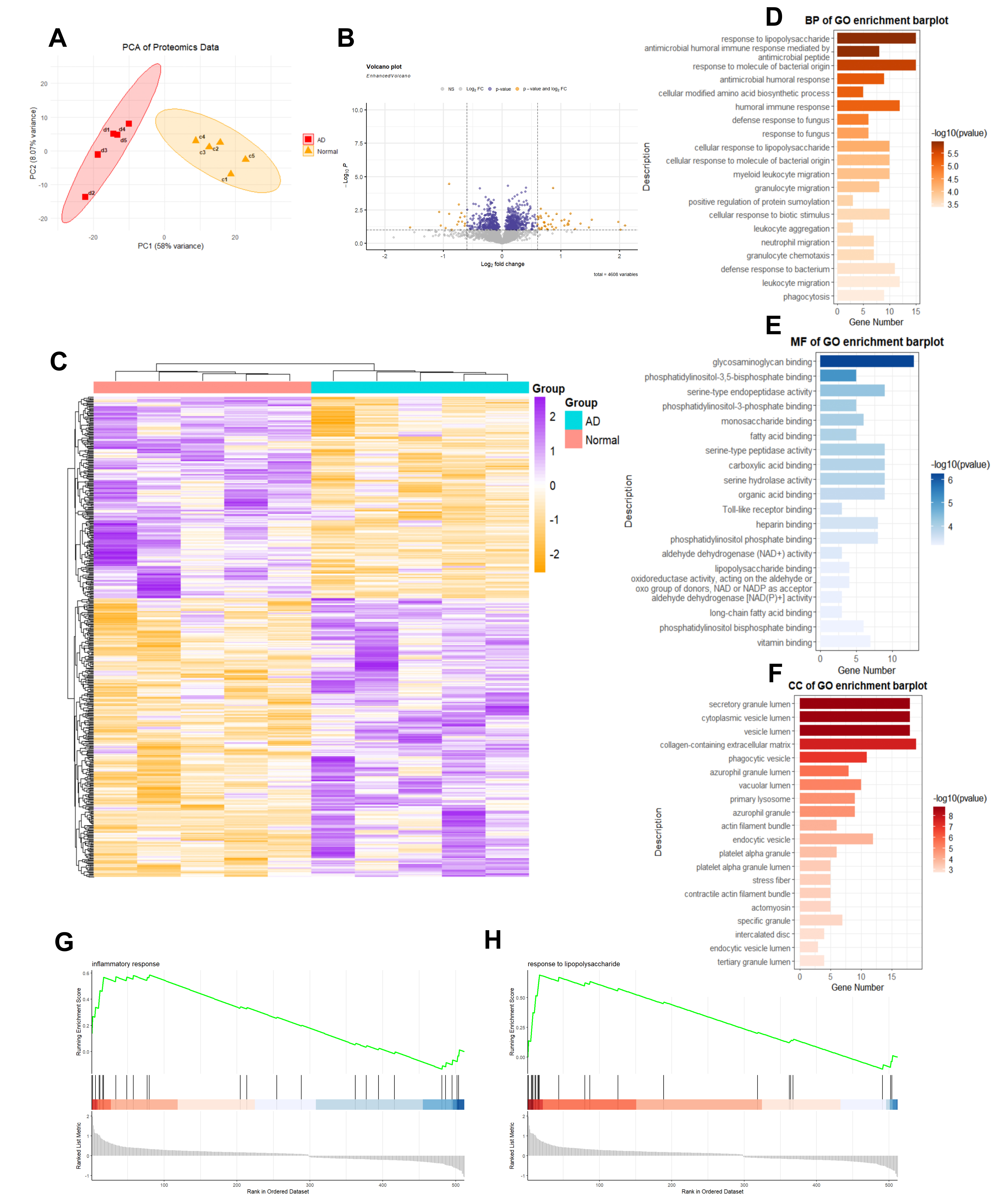 Fig. 1. Proteomic sequencing and analysis of type A aortic dissection (n = 5 for normal and dissection vascular samples). (A) Principal Component Analysis (PCA) of the proteomic data. (B) Volcano plot illustrating variable proteins (total proteins analyzed = 4608). (C) Heatmap depicting identified differential proteins. (D–F) Gene Ontology (GO) enrichment analysis of the differential proteins identified in proteomics (p.adj