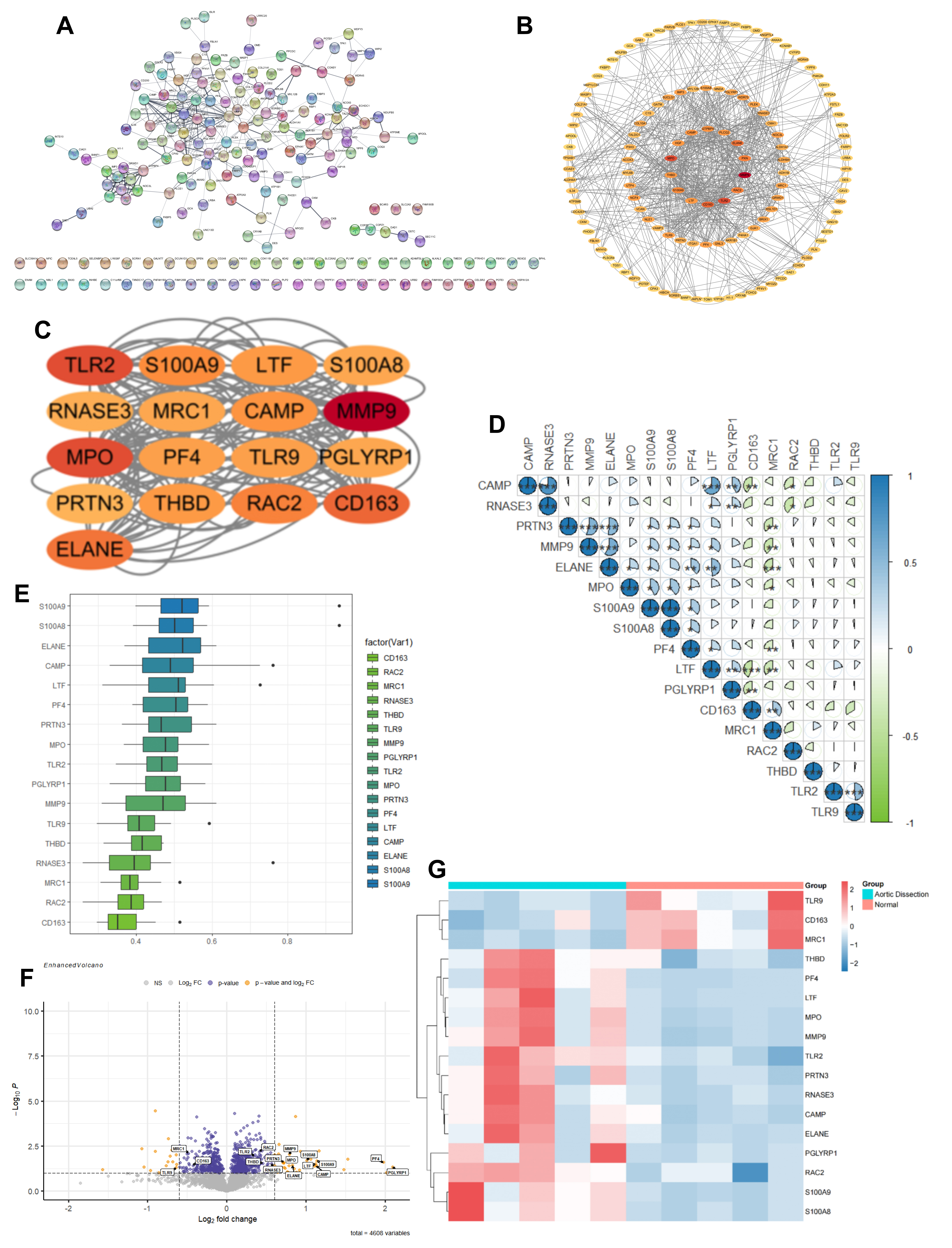 Fig. 2. Hub protein screening for type A aortic dissection. (A) Interaction network of differential proteins analyzed using the Search Tool for the Retrieval of Interacting Genes/proteins (STRING) database. (B) Importing protein interaction results into Cytoscape and ranking the proteins. (C) Identification of 17 hub proteins from the analysis of 138 proteins using the MCODE plugin. (D,E) Box plot and correlation heatmap of the final ranking for the 17 hub proteins from GOsensim analysis. (F) Volcano plot of the 17 hub proteins. (G) Heatmap of the 17 hub proteins, displaying each group separately. *p