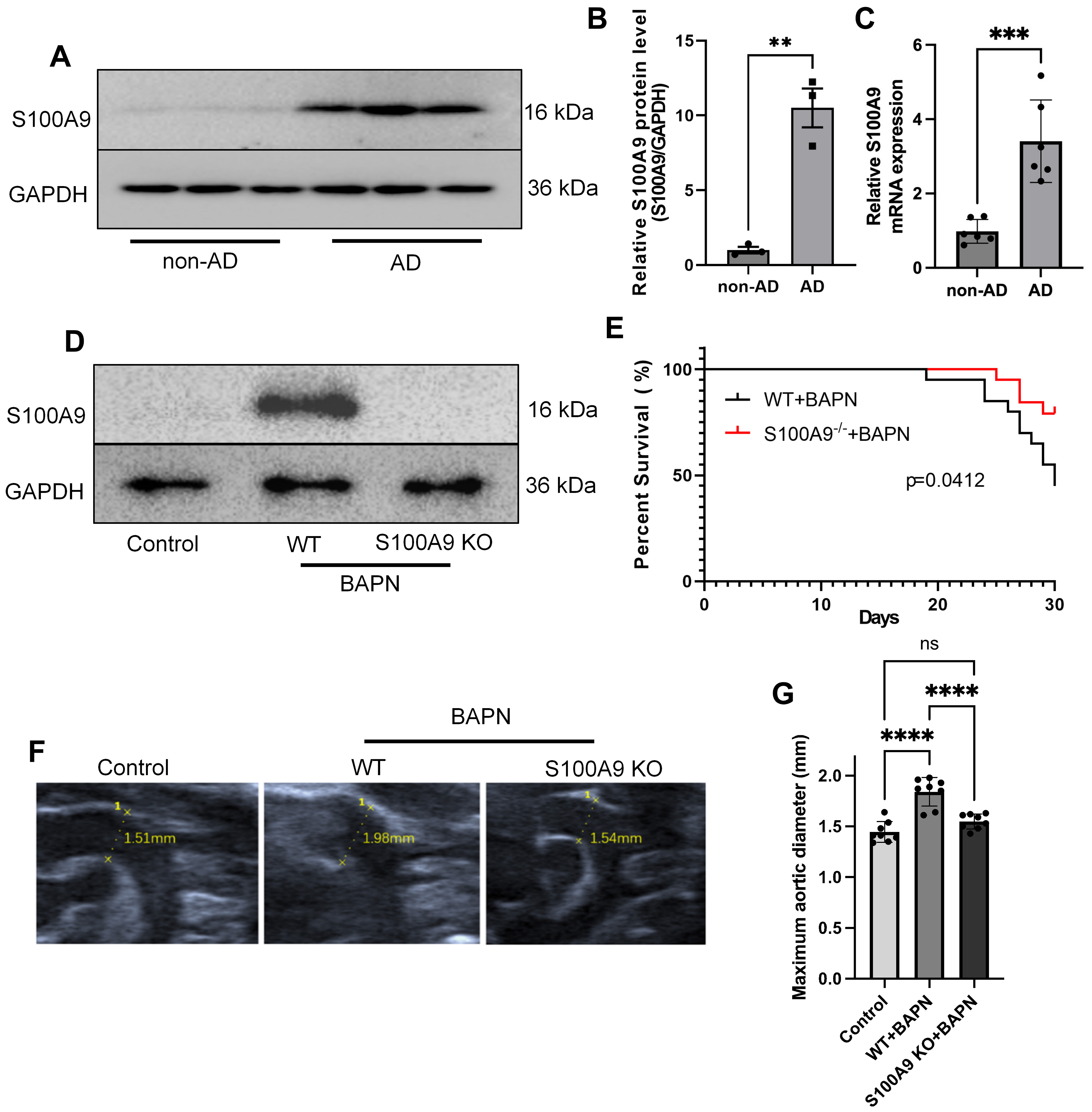 Fig. 3. Role of S100A9 in aortic dissection animal models. (A,B) Protein expression of S100A9 in aortic tissues from AD patients evaluated through Western blotting, with statistical analysis presented in (B) (n = 3). (C) S100a9 mRNA expression in vascular tissues (n = 6). (D) Protein expression of S100A9 in aortic tissues evaluated through Western blotting (n = 3). (E) Survival analysis of WT and S100a9 KO AD mice (45% vs 80%; p value = 0.0412). (F,G) Aortic diameter of mice across groups and the statistical result (p value