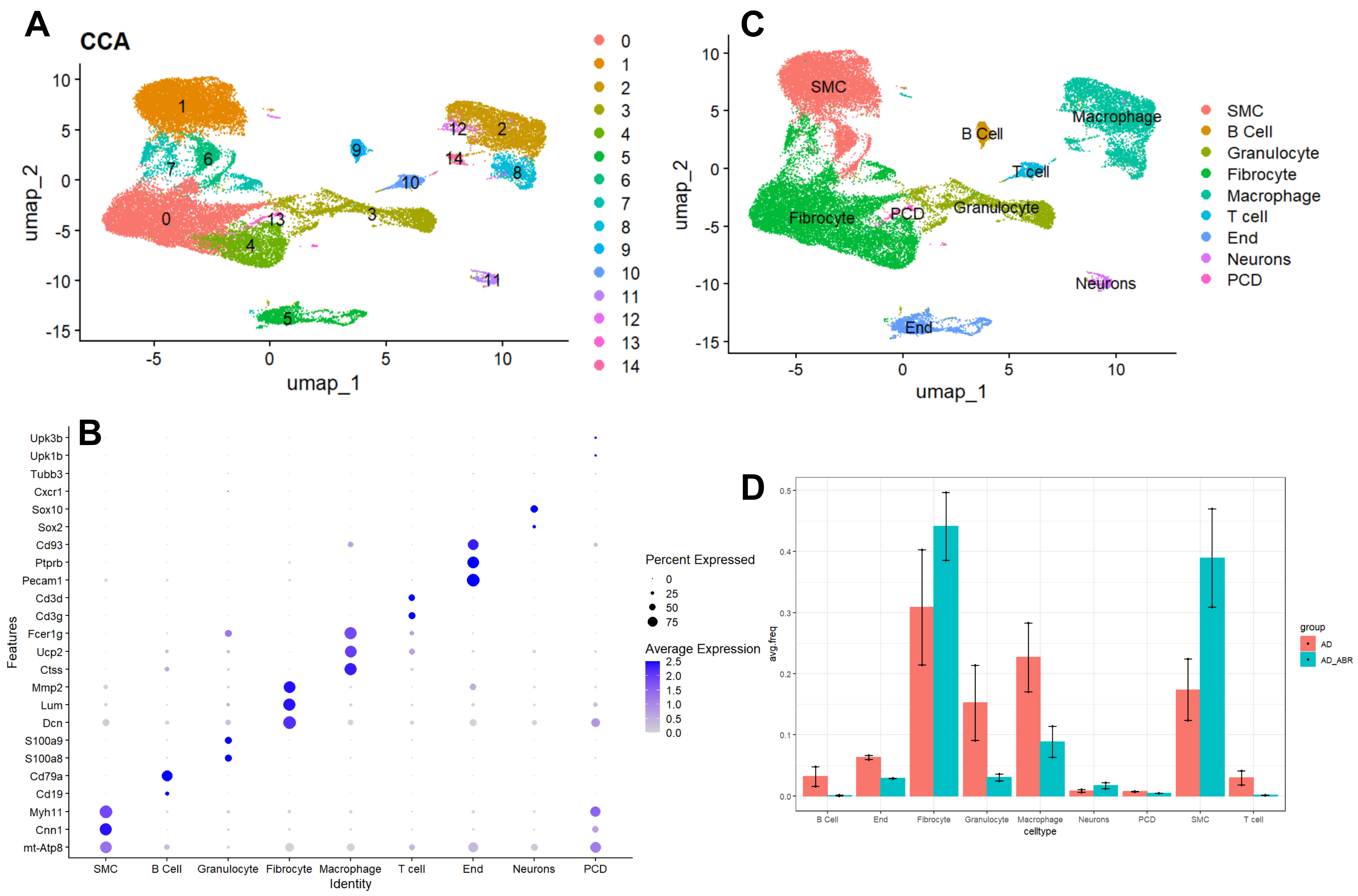 Fig. 4. Single-cell transcriptomic analysis of aortic dissection animal models with S100A9 intervention. (A) UMAP plot showing dimensionality reduction and clustering analysis of the GSE247260 dataset. (B) Bubble plot displaying the markers for each cluster. (C) UMAP plot illustrating the clustering based on marker expression. (D) Bar graph comparing the cell populations between the AD and AD+ABR groups (ABR, S100A9 inhibitor; 10 mg/kg/d).