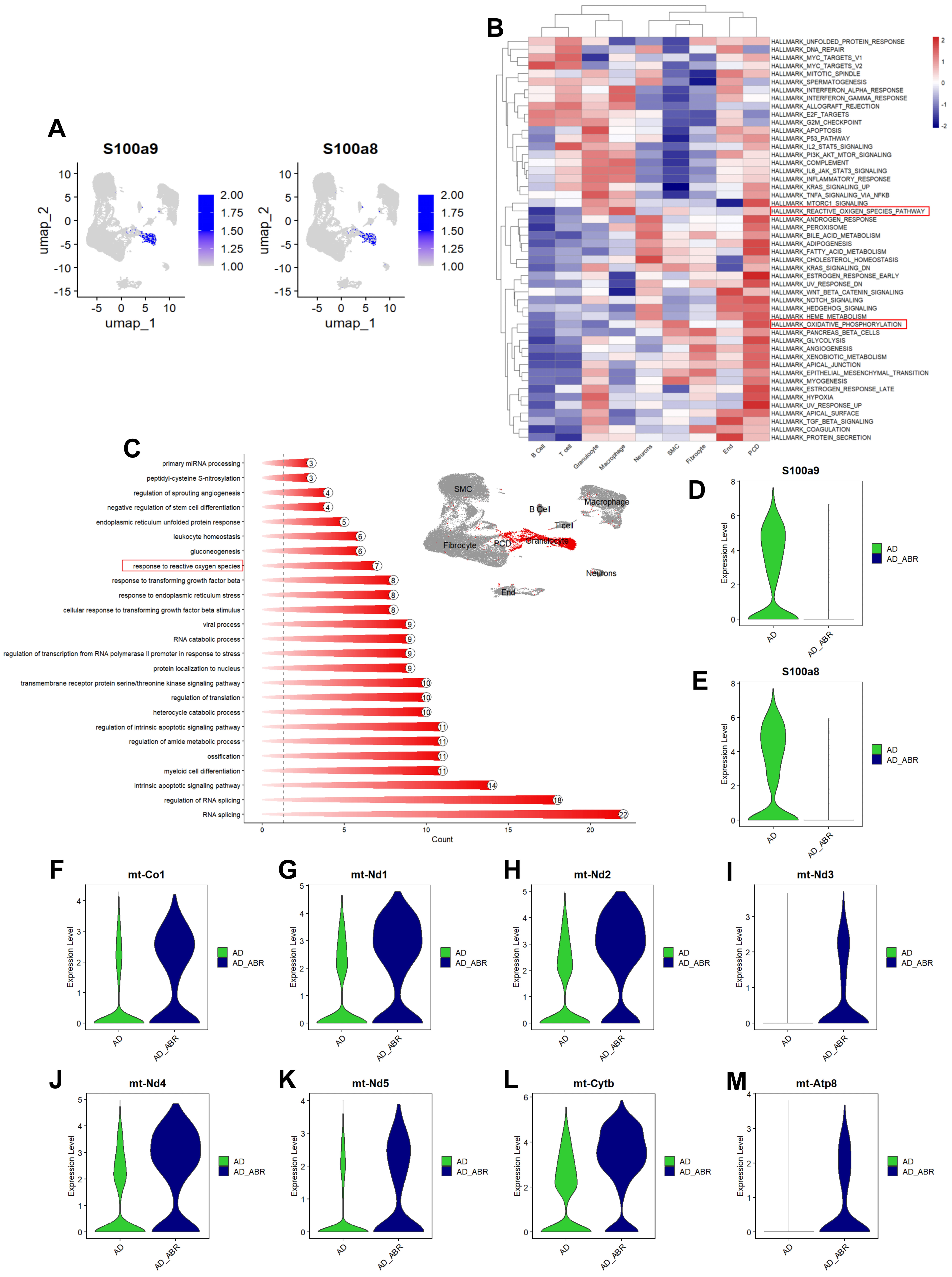 Fig. 5. Inhibition of S100a9 mitochondrial quality in granulocytes. (A) UMAP plots displaying the separate visualization of S100A9 and S100A8. (B) GSVA on granulocyte, with the visualized heatmap was reflecting changes in AD group (p.adj