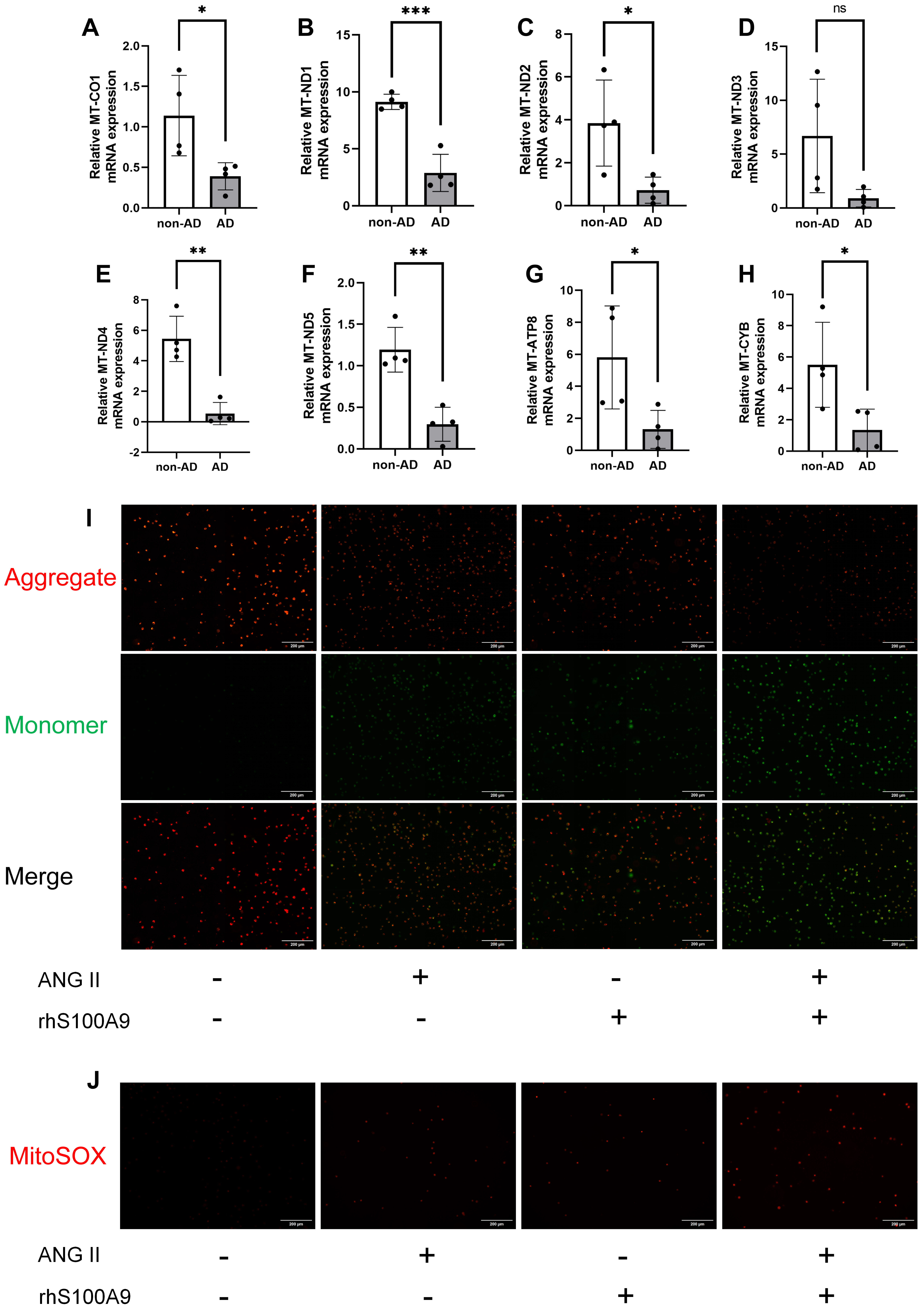 Fig. 6. S100A9 deteriorate mitochondrial quality. (A–H) The core mitochondrial genes mRNA expression in vascular tissues (n = 4). (I) JC-1 fluorescence images of THP-1 cells treated with Ang-II or recombinant human S100A9 (rhS100A9) for 24 hours (scale bar: 200 µm). (J) MitoSOX fluorescence images of THP-1 cells treated with Ang-II or rhS100A9 for 24 hours (scale bar: 200 µm). The data are presented as the mean