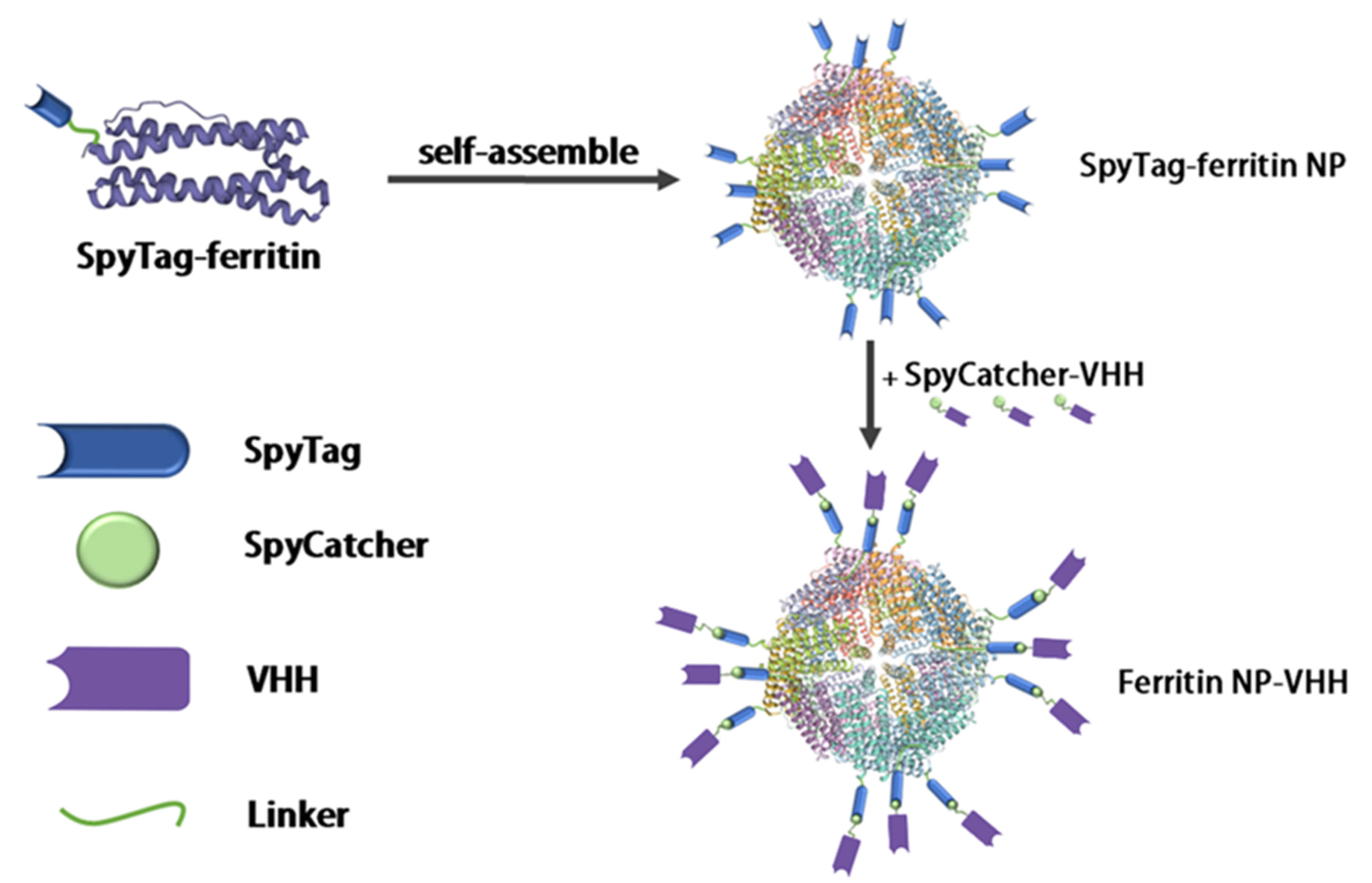 SpyTag-ferritin and SpyCatcher-VHH were mixed at a 1:1 molar ratio and incubated overnight at 4 °C. Ferritin-NP-VHH was then purified using a Superose 6 Increase size exclusion column. Impurities were removed by using a 220 nm filter prior to purify ferritin-NP-VHH.