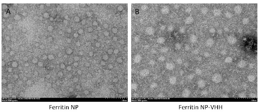 Images of ferritin particle (A) and ferritin-NP-VHH (B) were taken by transmission electron microscopy. Under the same magnification conditions, the particle size of ferritin-NP-VHH is significantly larger than that of ferritin particle. NP, nanoparticle. Scale bar = 100 nm.