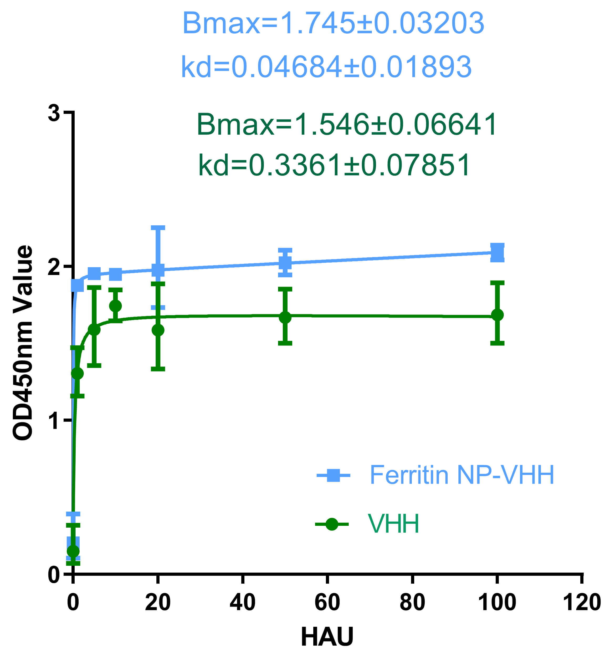 To evaluate the specific binding activity of ferritin-NP-VHH, monovalent VHH with influenza virus, ELISA plates were coated with H1N1 influenza virus overnight, after which equivalent amounts (0.03 µM each) of ferritin-NP-VHH or monovalent VHH were added to each well. The plates were read in a plate reader at an absorbance of 450 nm. Finally, the data were analysed by using GraphPad Prism software (version 5.0), and the binding constant Kd was calculated. The results showed that both ferritin-NP-VHH and monovalent VHH are efficiently bound to the influenza virus. However, compared with monovalent VHH, ferritin-NP-VHH was more sensitive to influenza virus capture by 7.18-fold, as shown in Fig. 3.