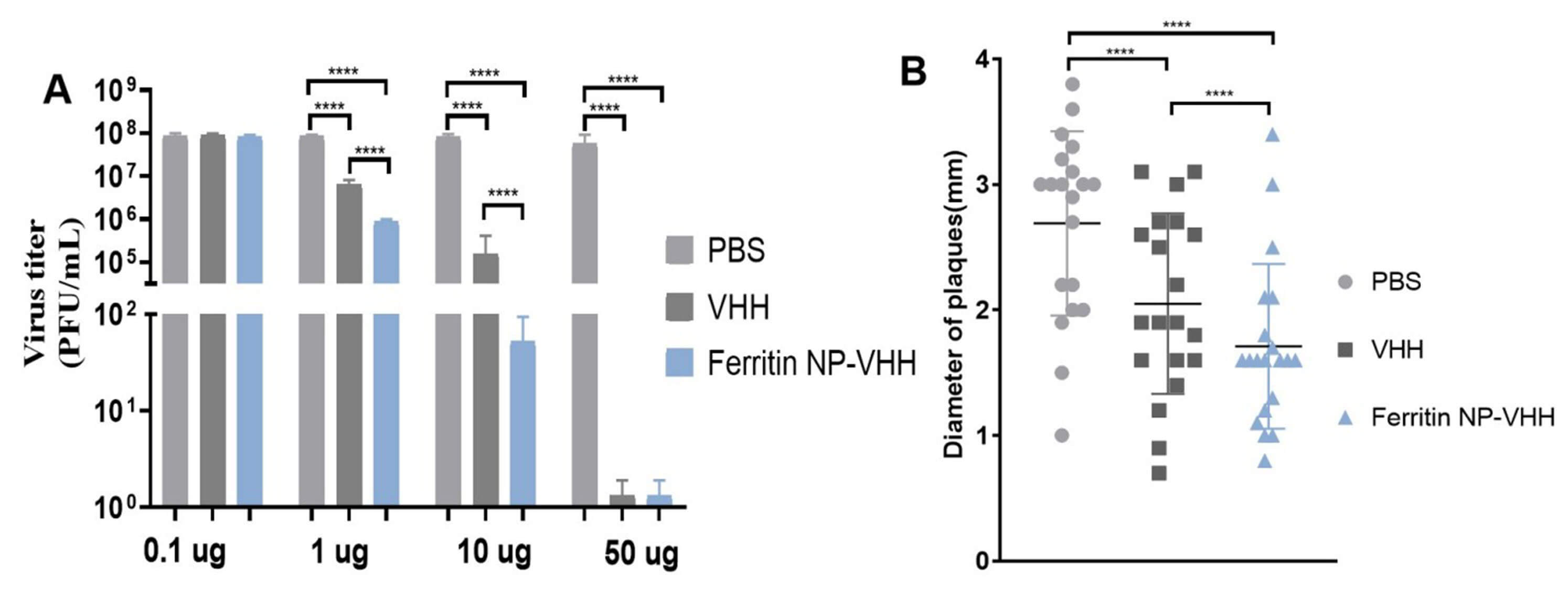 Next, we determined the specific neutralizing activity of ferritin-NP-VHH or monovalent VHH with influenza virus by using the standard plaque assay method. The neutralization and plaque size results show that ferritin-NP-VHH conferred higher neutralizing activity than monovalent VHH against the influenza virus, as shown in Fig. 4A,B.