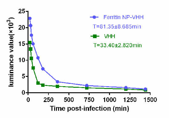To compare the half-life of ferritin-NP-VHH with that of monovalent VHH in vivo, the fluorescence values in the blood of BABL/c mice injected with ferritin-NP-VHH-FITC or monovalent VHH-FITC by tail vein were measured. The results show that the half-life of ferritin-NP-VHH in the blood is 2.44 times longer than that of monovalent VHH, as shown in Fig. 5.