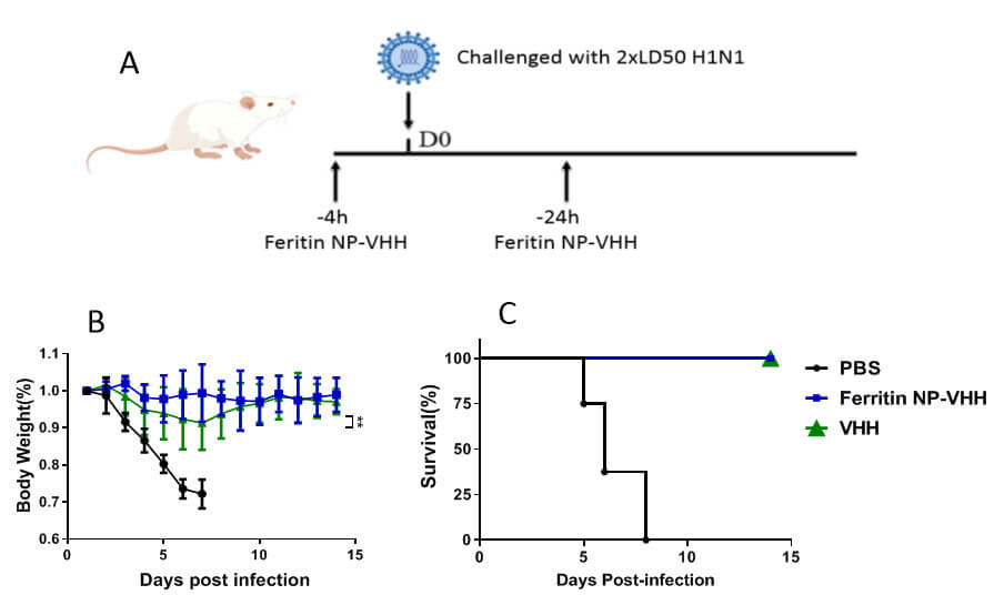 Compared with VHH alone, ferritin-NP-VHH improved the cross-neutralizing activity, stability and affinity for influenza virus in vitro and prolonged its half-life in vivo.