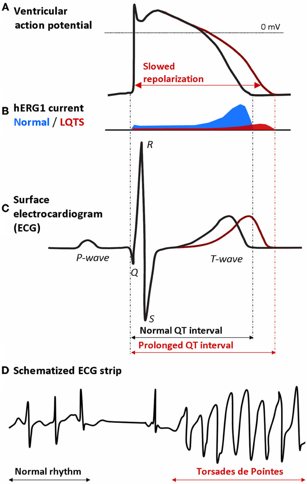 Mechanism by which a decrease in the hERG1 current (I𝐊𝐫) may lead to potentially life-threatening Torsades de Pointes in a long-QT syndrome type 2 (LQTS2) patient. (A) Prolongation of the ventricular action potential (AP) due to slowed repolarization. (B) Decrease in the hERG1 current (IKr) underlying the slowed repolarization. (C) Prolongation of the QT interval on the surface electrocardiogram (ECG) of the LQTS2 patient. (D) Onset of Torsades de Pointes: the regular rhythm is followed by a typical pause and then turns into an episode of Torsades de Pointes [7, 8]. Reproduced with permission from Grilo et al., Frontiers in Pharmacology; published by Frontiers Media S.A., Switzerland, 2010 [9].