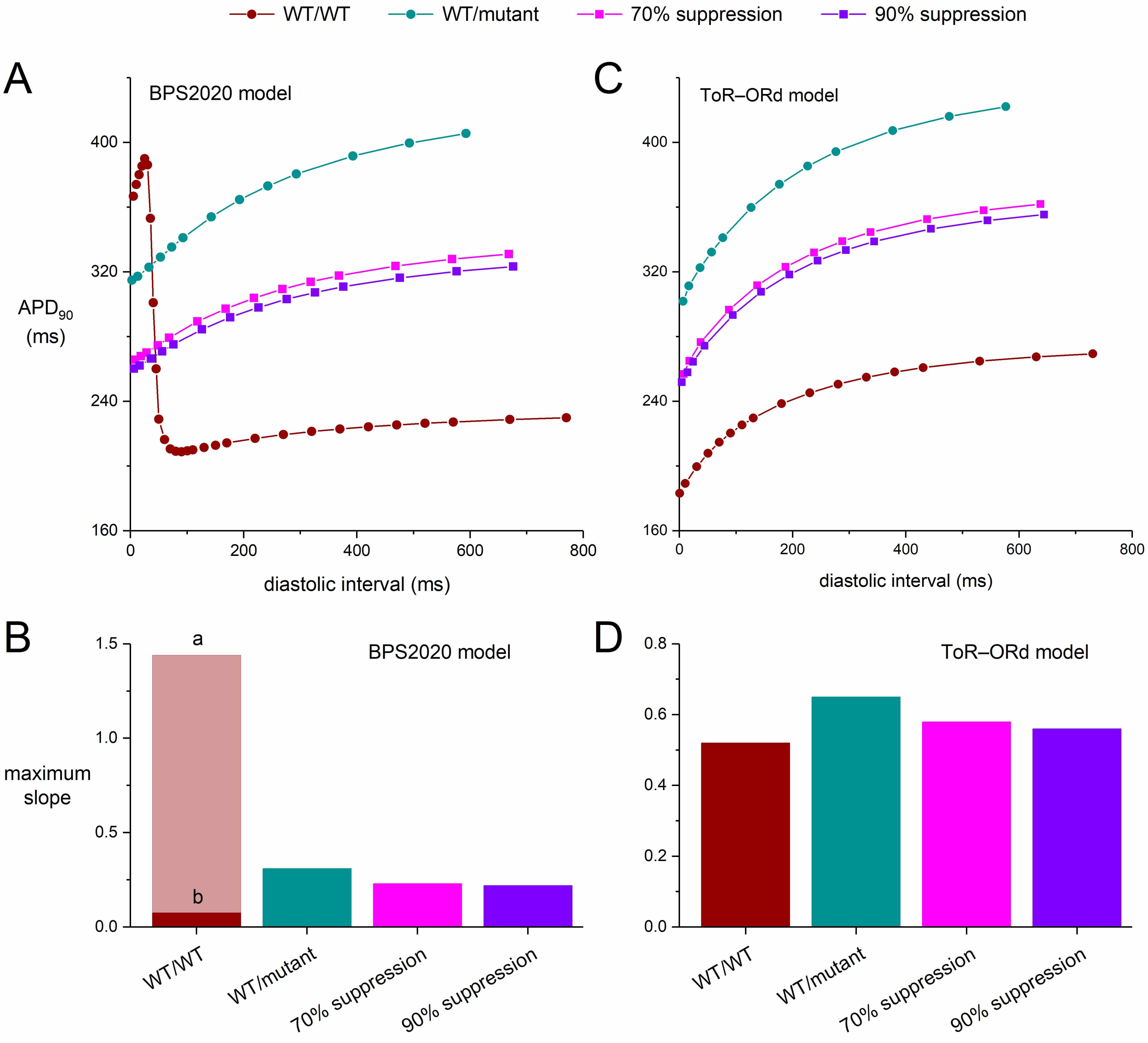Fig. 10 shows the APD restitution curves for both the BPS2020 and ToR–ORd models in the case of a mild mutation (Fig. 10A,C) as well as the maximum slopes of these curves (Fig. 10B,D). As with the severe mutation, the mild mutation steepens the APD restitution curve in both models (Fig. 10A,C; ‘WT/mutant’ vs. ‘WT/WT’ curves), facilitating arrhythmogenic effects. Silencing the mutant allele by 70% or by 90% again reduces the steepness of the curves, but their slope again remains higher than under WT/WT conditions. The restitution curves at 70% and 90% suppression (Fig. 10A,C; ‘90% suppression’ vs. ‘70% suppression’ curves) are highly similar, which is to be expected from the only small additional silencing effect of 90% suppression compared to 70% suppression (setting the conductance of IKr to 52.59% vs. 50.07% of its control value).