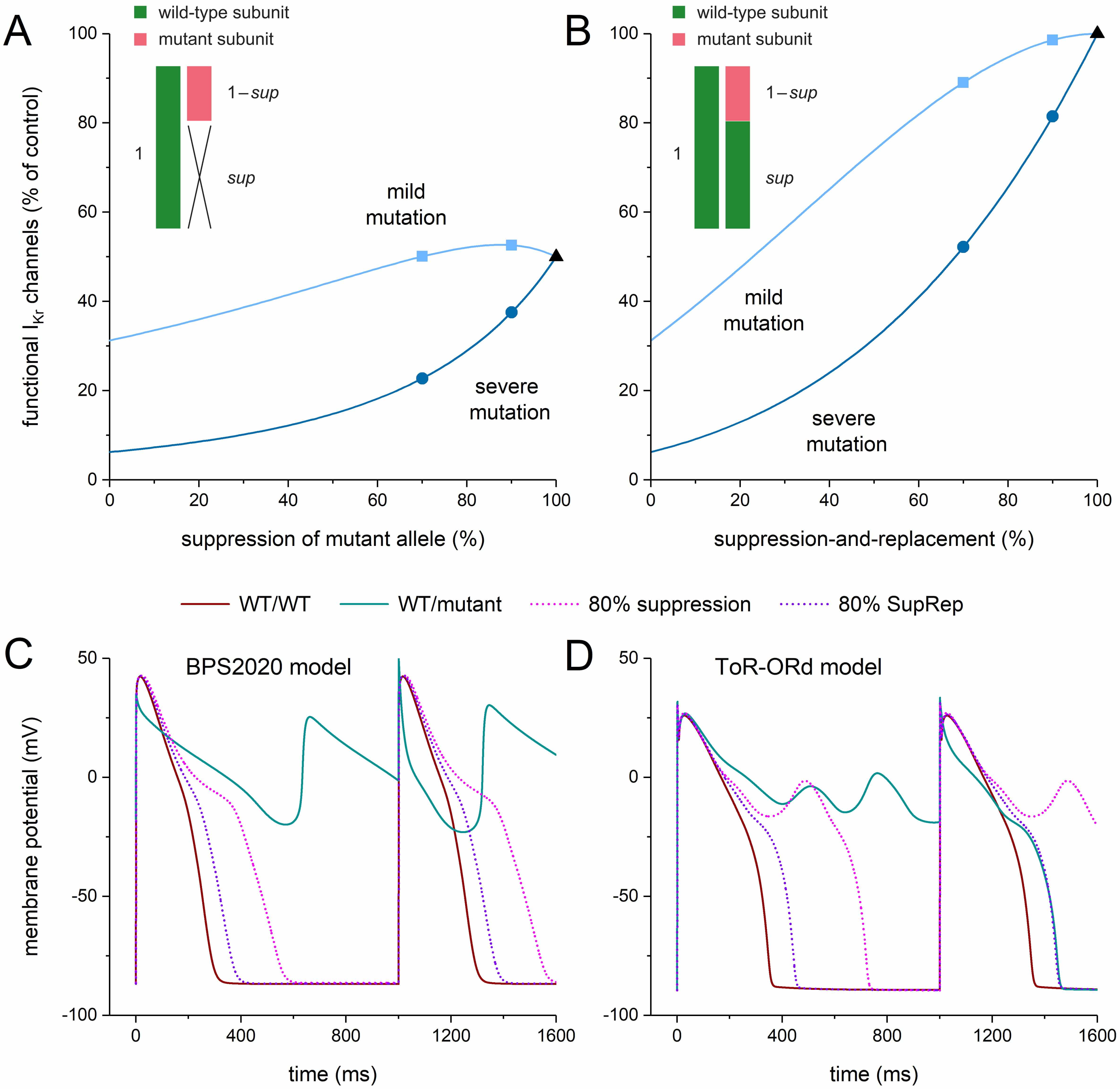 Fig. 11C,D illustrates the effects of 80% suppression-and-replacement as compared to 80% suppression per se in the midmyocardial versions of the BPS2020 model (Fig. 11C) and the ToR–ORd model (Fig. 11D) in the case of a severe mutation in KCNH2. In the BPS2020 model, the repetitive EAD pattern is no longer observed with 80% suppression, as in the case of the 70% and 90% suppression of Fig. 3B. However, the associated APD90 is increased by as much as 251 ms compared to WT/WT (from 283 to 534 ms; +89%). This increase is strongly reduced to 75 ms (+26%) with 80% suppression-and-replacement (Fig. 11C). In the ToR–ORd model, the 80% suppression is not sufficient to stop the development of EADs (Fig. 11D), as in the case of the 70% and 90% suppression of Fig. 3E. EADs are not observed with 80% suppression-and-replacement. A regular AP pattern occurs with an APD90 that is increased by 95 ms compared to WT/WT (from 348 to 444 ms; +27%).