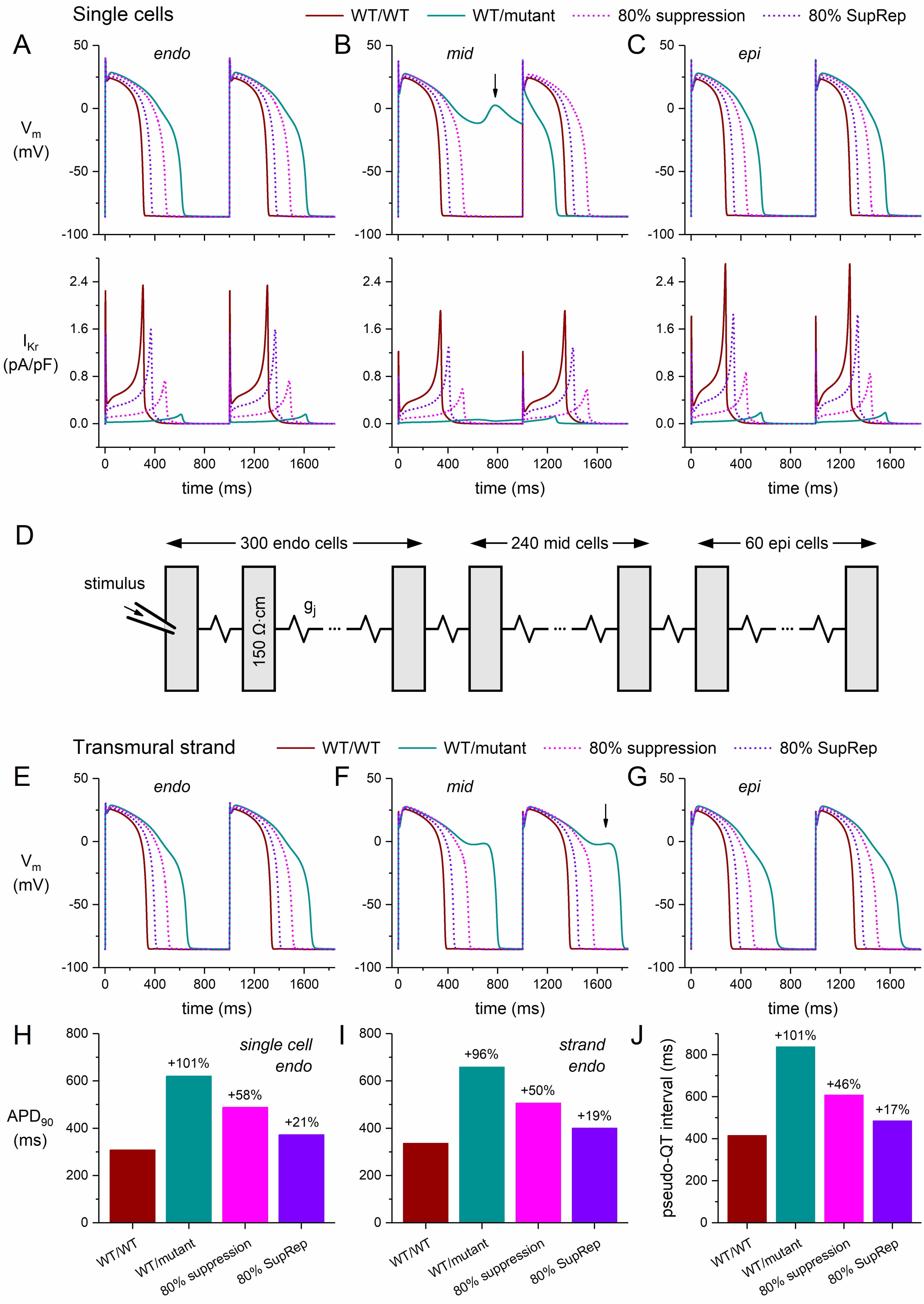 First, we assessed the shape of the APs and associated IKr of the endocardial, midmyocardial, and epicardial single-cell versions of the updated TP06 model, not only under control conditions, but also in the case of a severe mutation in KCNH2 and its suppression. The obtained action potentials and IKr are shown in Fig. 12A–C. The WT/WT and WT/mutant traces resemble those of the BPS2020 and ToR–ORd models (Fig. 3B,E), including the significant increase in APD90 (by 101% from 308 to 620 ms; Fig. 12A,H) and the emergence of EADs in the midmyocardial version of the model (Fig. 12B, vertical arrow). Similar to the ToR–ORd model (Fig. 3E), the midmyocardial cell exhibits an alternating pattern of incomplete and short APs in the WT/mutant case. Similar to the 70% and 90% suppression in the BPS2020 and ToR–ORd models (Fig. 3A,D, dotted lines), applying the 80% suppression to the default (endocardial) version of the updated TP06 model reduces the increase in APD90 from +101% to +58% (Fig. 12A,H). Silencing by 80% suppression-and-replacement further reduces the increase in APD90 to +21% (Fig. 12A,H).