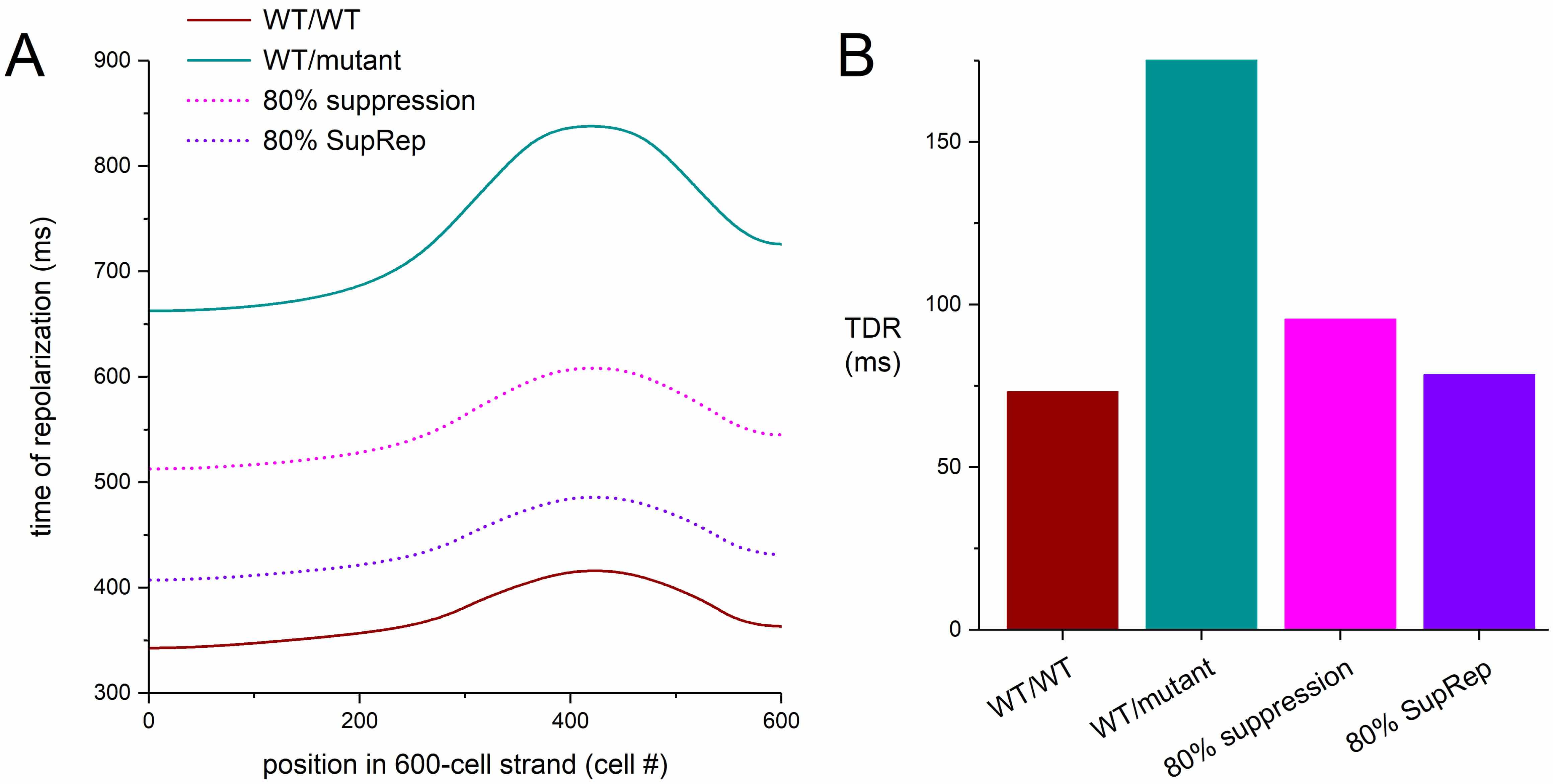Augmentation of the transmural dispersion of repolarization (TDR) has since long been associated with the development of potentially lethal reentrant arrhythmias [57, 58, 59, 60, 61, 62, 63, 64]. Fig. 13 shows that the simulation results of Fig. 12 are accompanied by a substantial increase in TDR with a severe loss-of-function mutation in KCNH2, with an increase in TDR from 73 ms under WT/WT conditions to as much as 175 ms (+139%) under WT/mutant conditions (Fig. 13B). This TDR is reduced to 96 ms (+30%) in response to 80% suppression per se and to 78 ms (+7%) in response to 80% suppression-and-replacement (Fig. 13B).