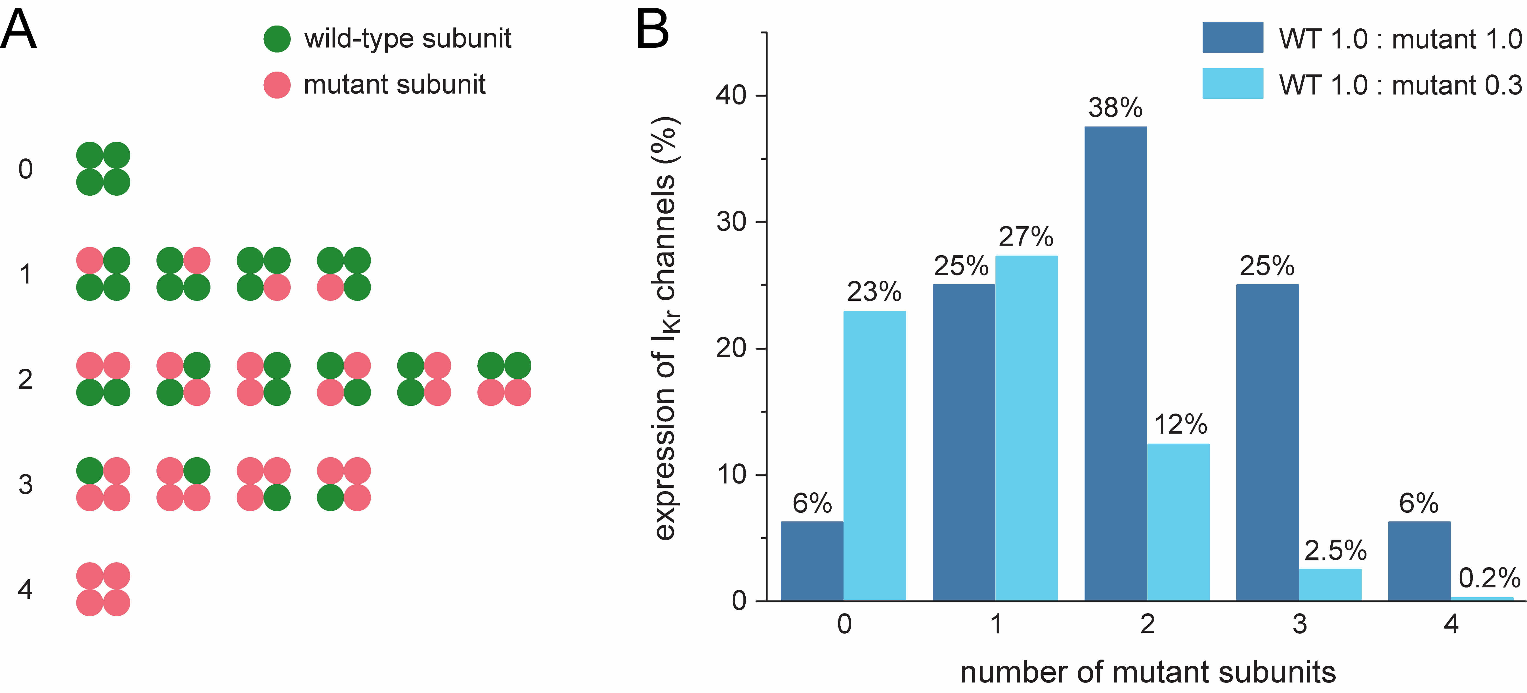 It has been shown that mutant and wild-type Kv channel subunits randomly co-assemble into functional tetramers [10]. Thus, these tetramers would contain 0 to 4 mutant subunits according to a binomial distribution with parameters n = 4 and p = 0.5, representing all possible combinations of a total of four wild-type or mutant subunits. This explains the common dominant-negative nature of LQTS1 and LQTS2 loss-of-function mutations in the KCNQ1 and KCNH2 genes [11, 12], provided that wild-type (WT) and mutant Kv7.1 and Kv11.1 subunits are similarly translated and processed and then randomly co-assembled into tetramers [6]. Most mutations in KCNH2 result in such a dominant-negative effect, but the severity of the resulting phenotype varies widely [13]. The latter may be envisioned by only 1/16th of the channels (containing only WT subunits) being functional in the case of a severe dominant-negative mutation and 5/16th of the channels (containing at most one mutant subunit) being functional in the case of a mild dominant-negative mutation, not to mention other effects of a mutation, such as changes in channel kinetics or accelerated degradation of the wild-type subunit [14].