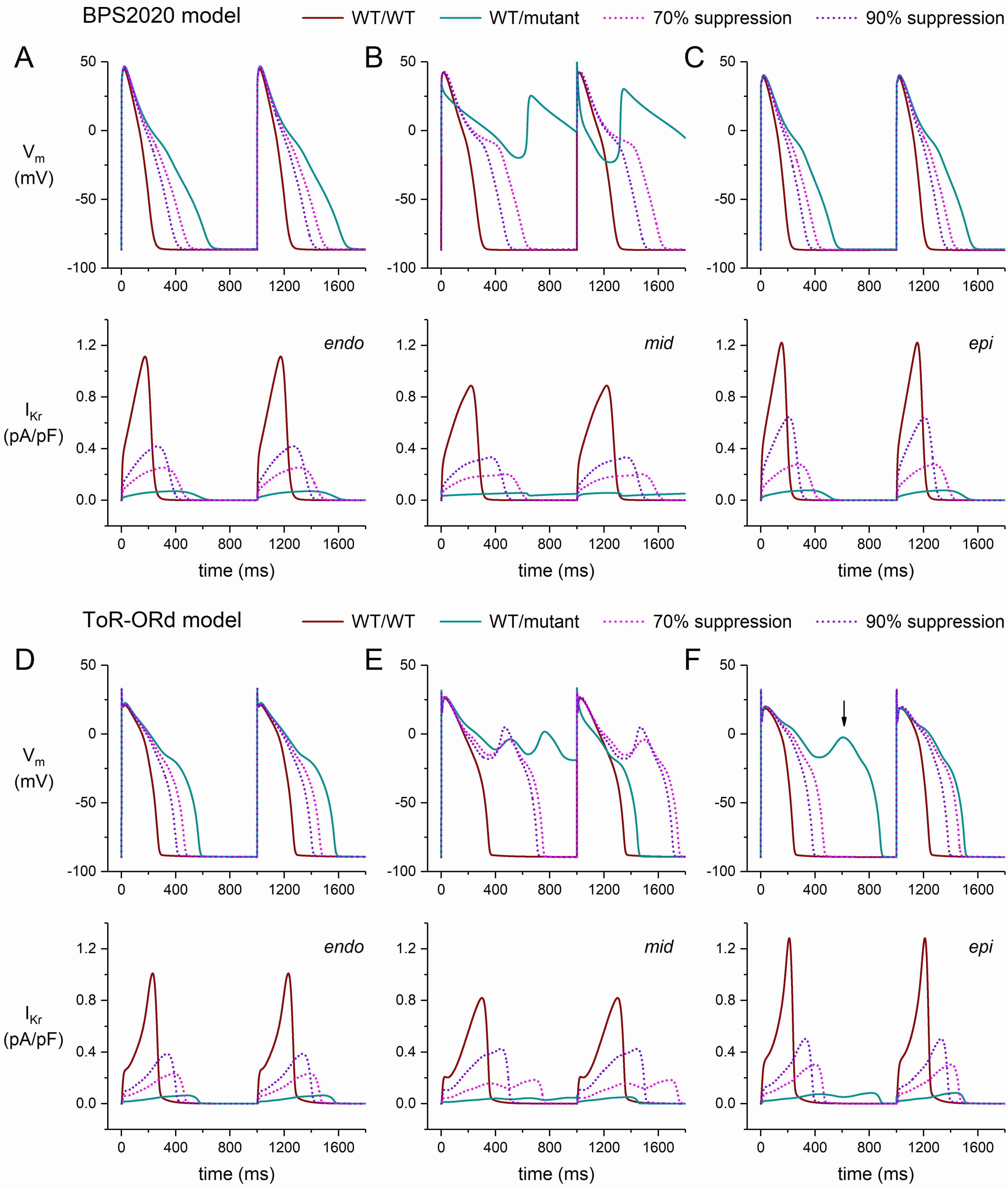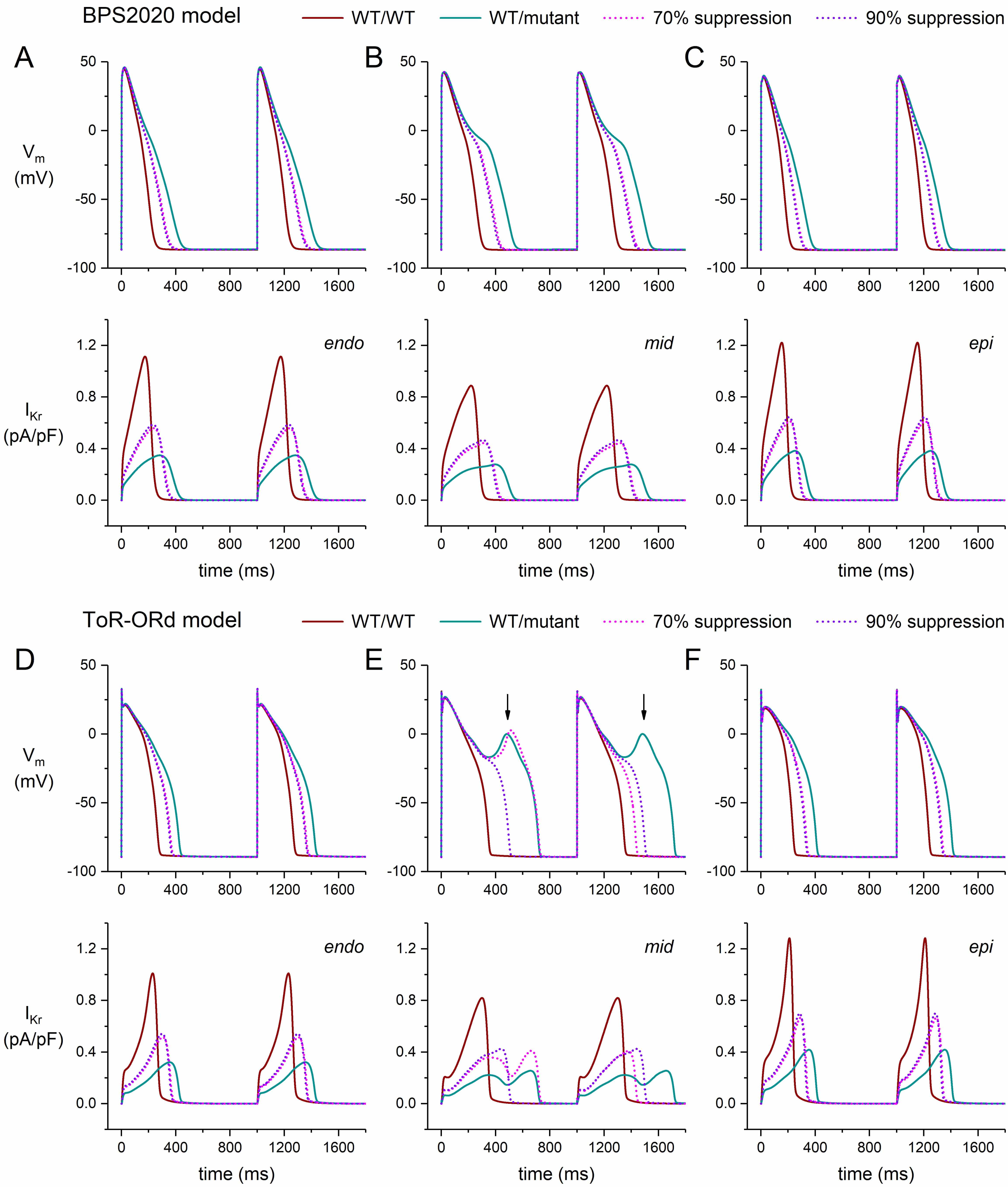 Midmyocardial cells (“M cells” [44, 45]) have a longer AP than endocardial and epicardial cells, largely because of their substantially smaller IKs, which reduces their repolarization reserve and makes them more vulnerable to a decrease in IKr. This vulnerability is demonstrated in our simulations of the electrical activity of M cells in the presence of a severe mutation in KCNH2 (Fig. 3B,E, ‘WT/mutant’ traces). In the repetitive pattern of the BPS2020 model, repolarization becomes entirely incomplete (Fig. 3B), whereas it becomes partially incomplete in the repetitive pattern of the ToR–ORd model (Fig. 3E).