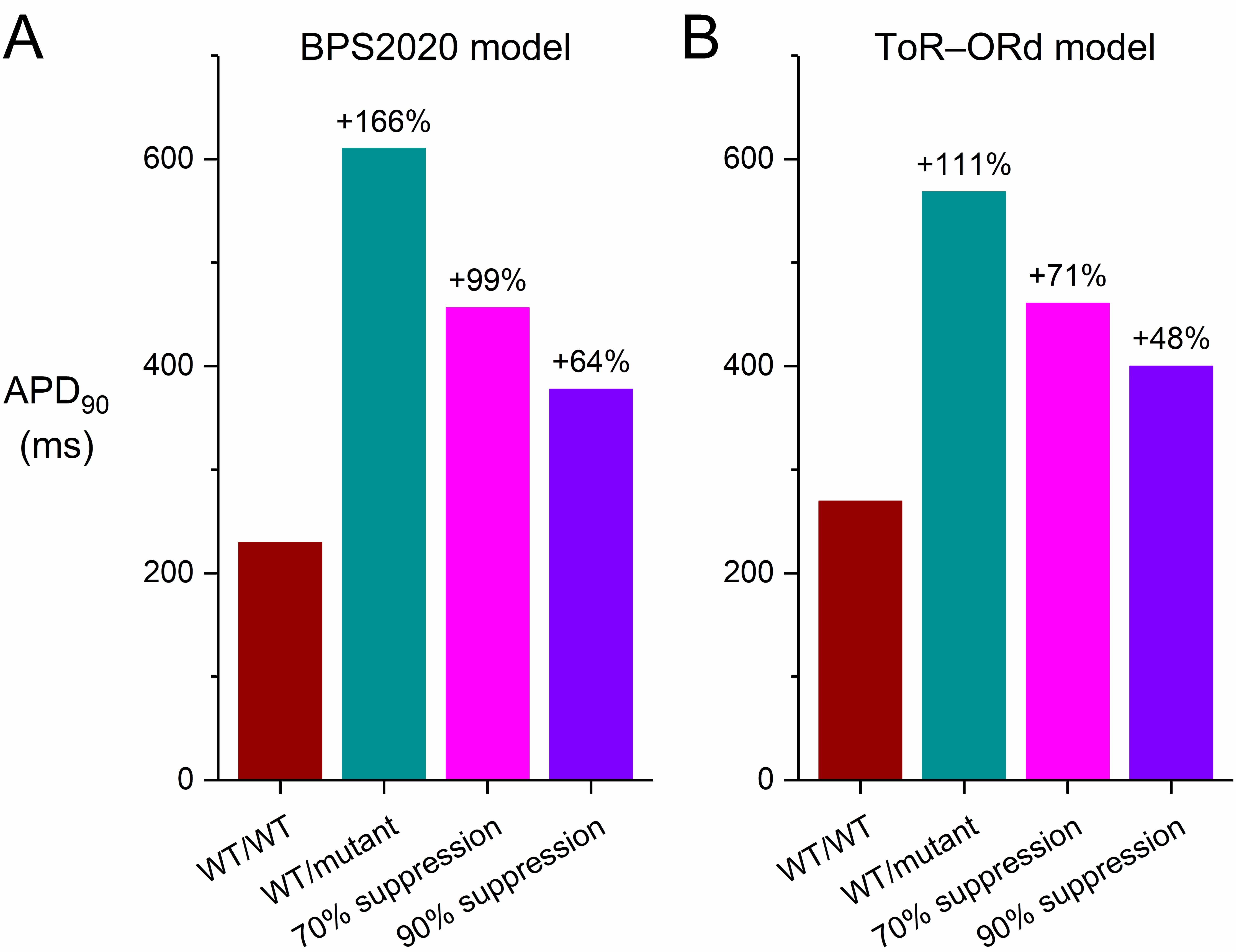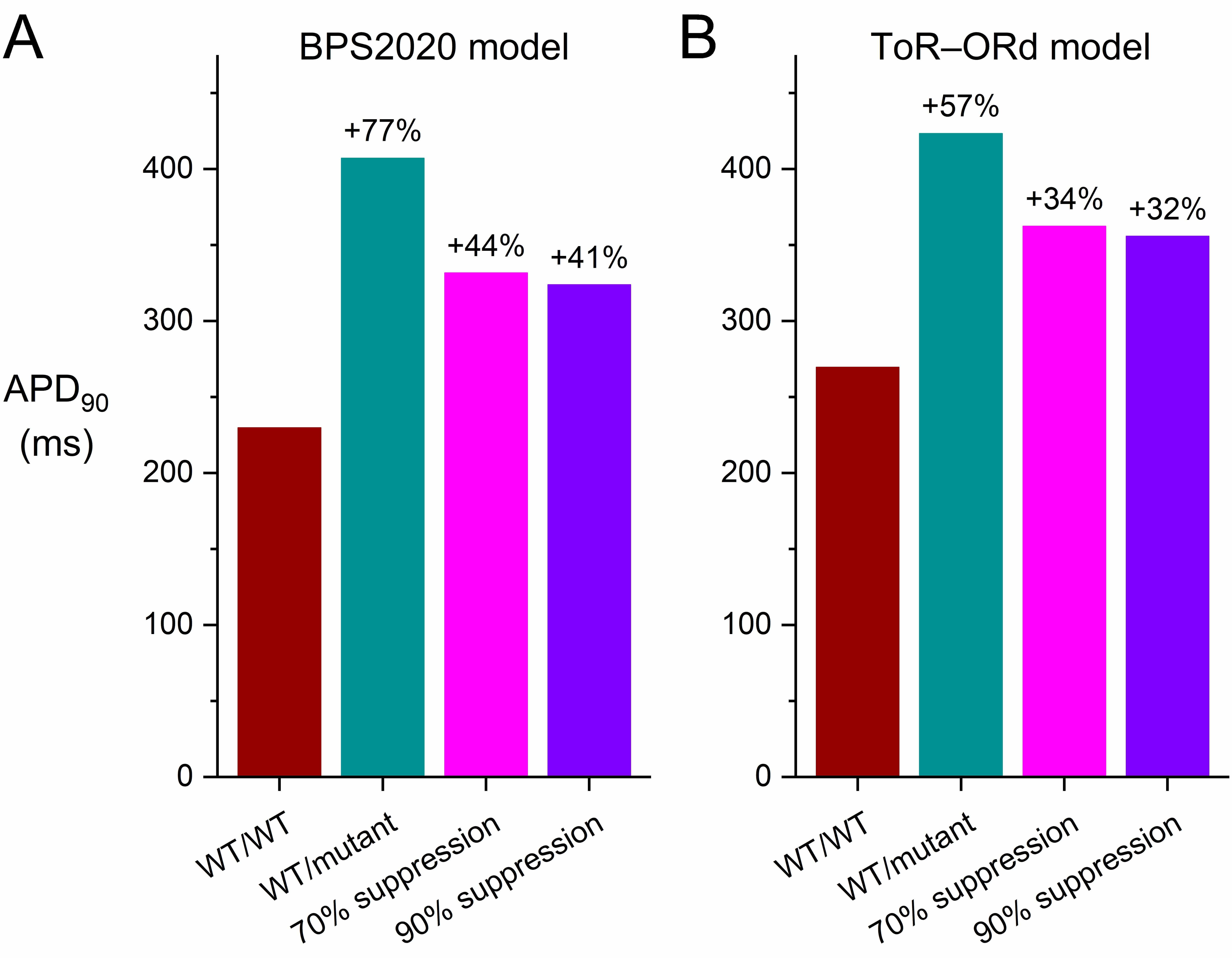 Fig. 8 shows the results of the simulations we performed with the endocardial, midmyocardial, and epicardial versions of the BPS2020 and ToR–ORd models of the electrical activity of a single human ventricular cardiomyocyte paced at 1 Hz (Fig. 8A–C and Fig. 8D–F, respectively). In their default endocardial versions, both models show a marked slowing of their repolarization (Fig. 8A,D, top panels) due to the also marked reduction of IKr (Fig. 8A,D, bottom panels) when their fully-activated conductance is reduced to 5/16th (31.25%) of its control value (‘WT/mutant’ vs. ‘WT/WT’ traces). The APD90 of the BPS2020 model increases from 230 to 407 ms (+77%; Fig. 9A, left two bars) and that of the ToR–ORd model from 270 to 423 ms (+57%; Fig. 9B, left two bars). Silencing of the mutant allele by 70% or 90% has an almost identical effect on IKr(Fig. 8A,D, bottom panels), reducing the increase in APD90 of the BPS2020 model to 332 ms (+44%) and 324 ms (+41%), respectively (Fig. 9A), and that of the ToR–ORd model to 362 ms (+34%) and 356 ms (+32%), respectively (Fig. 9B).