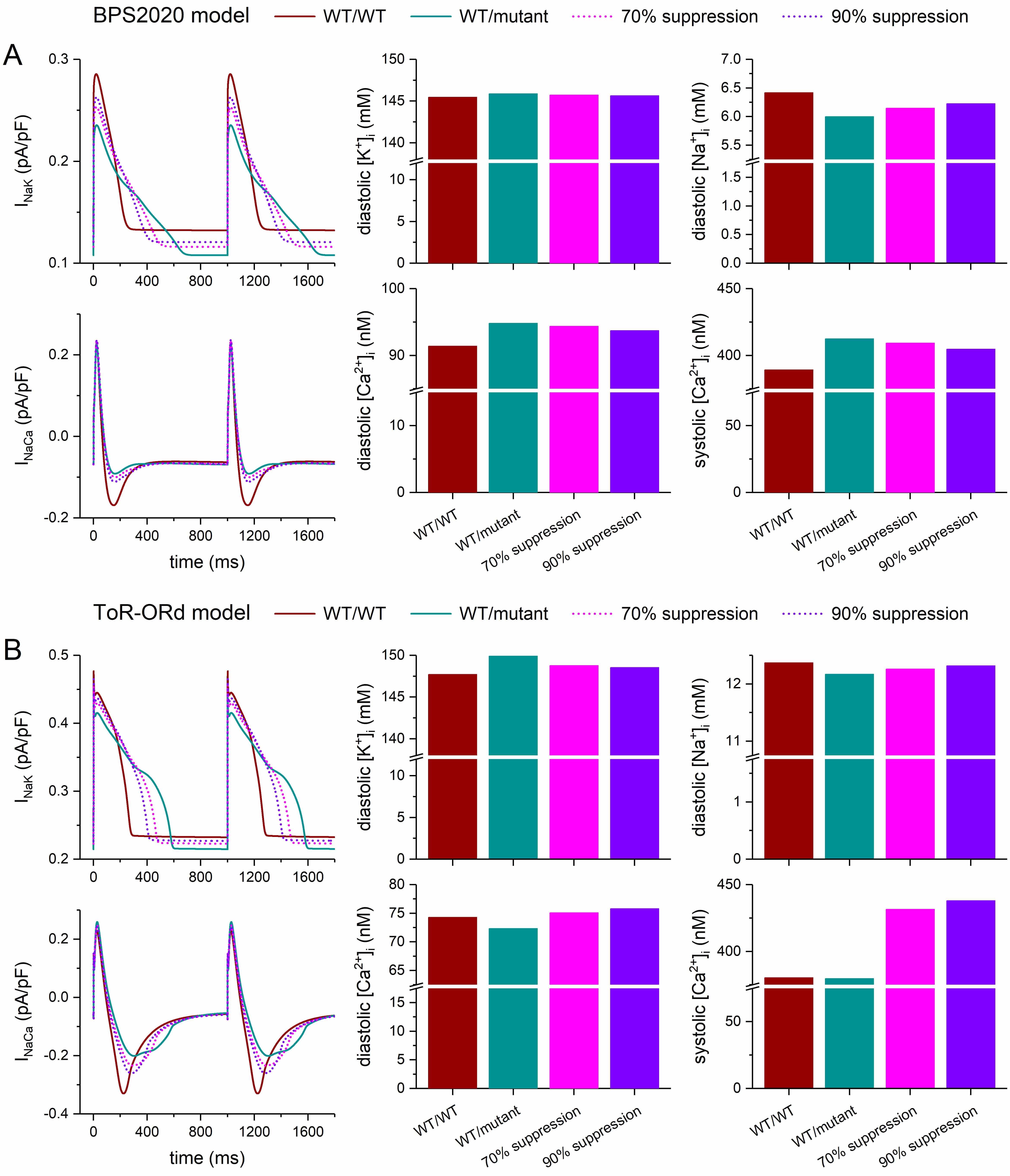 Fig. 7 also shows the effects of the severe mutation on the diastolic and systolic [Ca2+]i levels as well as the effects of silencing of the mutant allele. In this regard, the two models differ not only quantitatively but also qualitatively. The BPS2020 model shows a 3.8% mutation-induced increase in diastolic [Ca2+]i (Fig. 7A, bottom middle panel), whereas the ToR–ORd model shows a 2.6% decrease (Fig. 7B, bottom middle panel). Similarly, the BPS2020 model shows a 6.0% mutation-induced increase in systolic [Ca2+]i (Fig. 7A, bottom right panel), while the ToR–ORd model shows a 0.2% decrease (Fig. 7B, bottom right panel). In the BPS2020 model, the increases in the diastolic and systolic [Ca2+]i levels are both reduced with 70% and 90% silencing, and this effect is larger with 90% silencing (decreasing from 3.8% to 3.3% and 2.6% for diastolic [Ca2+]i, and from 6.0% to 5.1% and 4.0% for systolic [Ca2+]i). These increases are further reduced with full, 100% silencing, to 1.9% for diastolic [Ca2+]i and 3.0% for systolic [Ca2+]i.