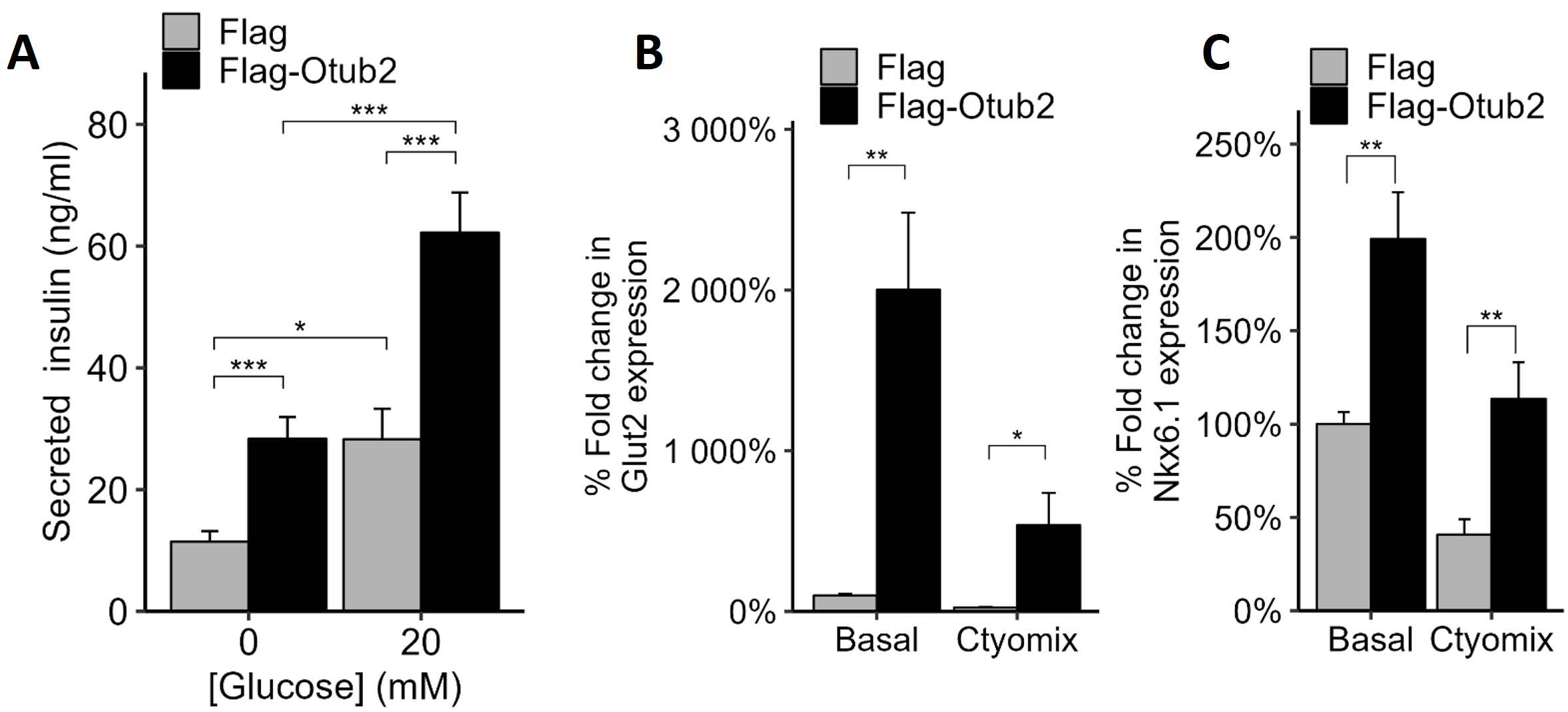 MIN6 cells or human islets were seeded (500,000 cells/well in 6-well plates for MIN6 cells, and 1000 islets/well in 96-well plates for human islets) and 24 hours post-seeding, the cells or human islets were transfected with pFlag or pFlag-Otub2 vectors (3 µg/well for a 6-well plate and 0.2 µg/well for a 96-well plate) using the transfection reagent Lipofectamine 2000 (Thermo-Fisher Scientific, Waltham, MA, USA), according to the manufacturer’s instructions.