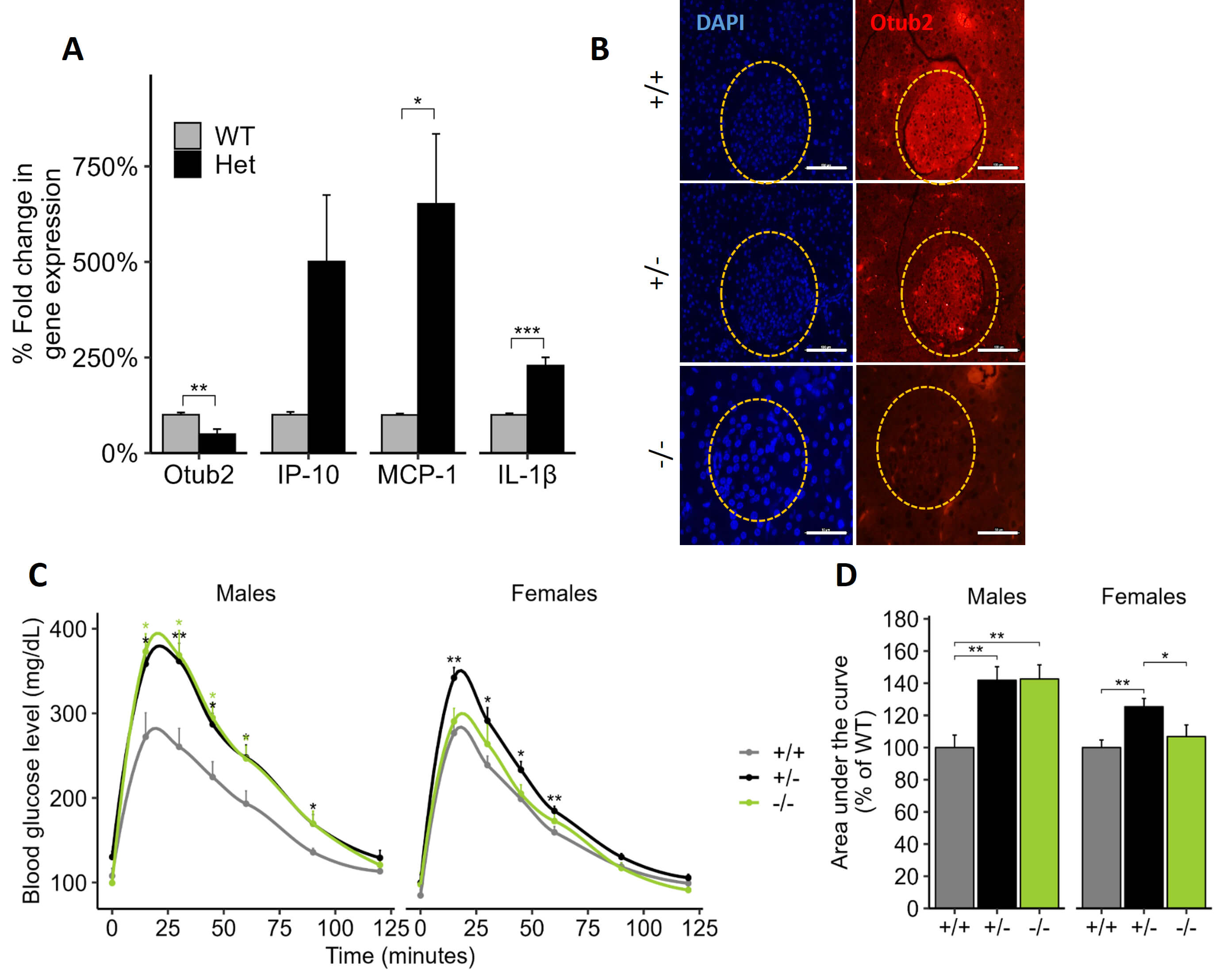 Next, glucose tolerance tests (GTT) were performed in Otub2+/+, Otub2+/-, and Otub2-/- mice. As shown in Fig. 4C, basal glucose levels of Otub2+/+, Otub2+/-, and Otub2-/- male and female mice were approximately similar. However, following glucose injection, blood glucose levels, at all-time points, were significantly higher in Otub2+/- and Otub2-/- male mice, when compared to Otub2+/+ animals (Fig. 4C). Accordingly, the area under the curve (AUC) was ~40% greater in Otub2+/- and Otub2-/- male mice compared to WT controls (Fig. 4D). The effects of Otub2 deletion on the female mice were a bit more complex. There were no differences in GTT between Otub2+/+ and Otub2-/- female mice, but the Otub2+/- animals exhibited a slight, yet significant higher GTT response (Fig. 4C) that was also evident by a modest, yet significant higher (approximately 20%) AUC (Fig. 4D). These results suggest a positive role for Otub2 in the improvement of islet functionality under physiological conditions in an in vivo setting, with possible compensatory pathways in KO female mice.