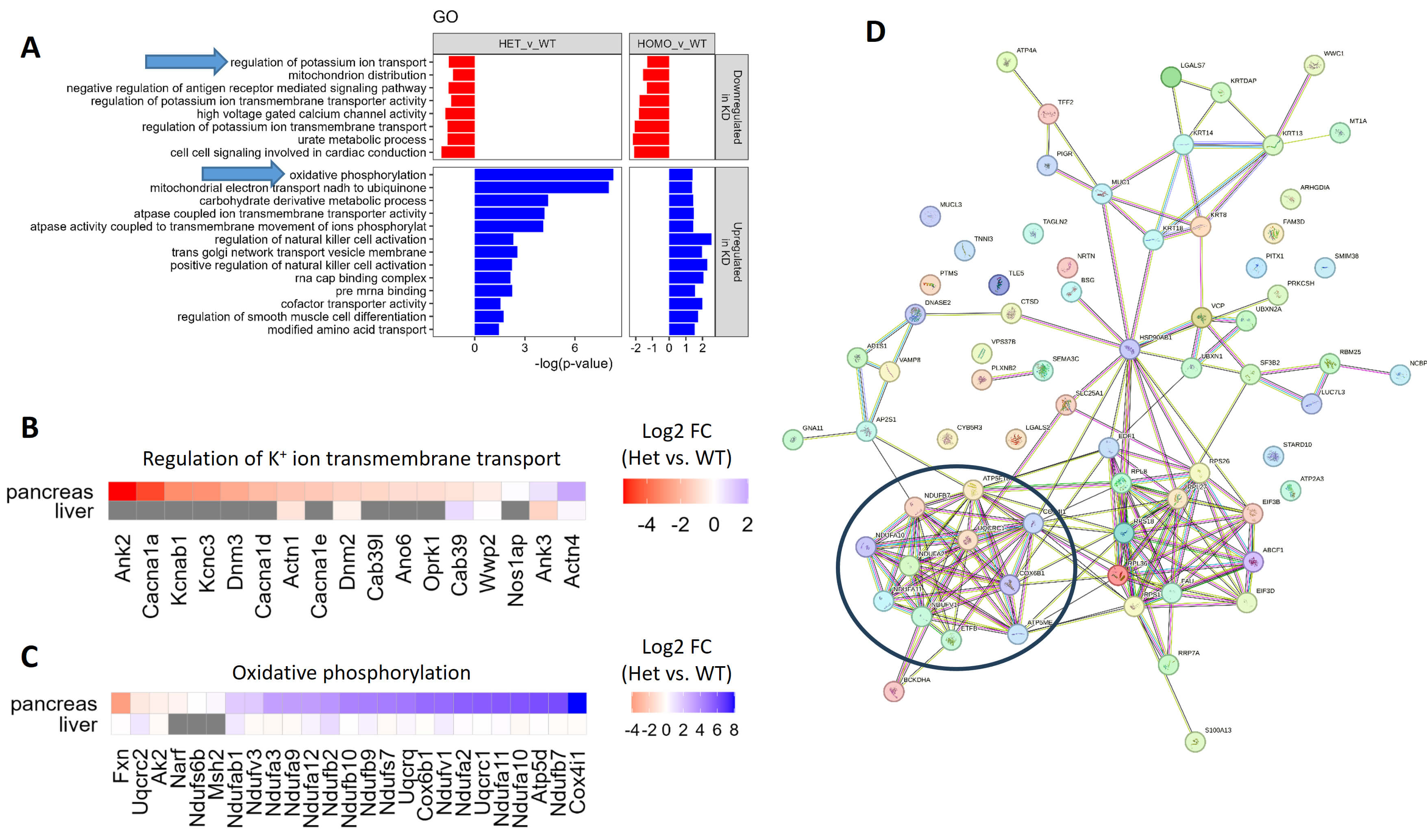 RNA-seq analysis of pancreas from OTUB2 KO mice. Pancreases and livers were extracted from OTUB2+/+ (WT, n = 3), OTUB2+/- (Heterozygotes, n = 5) and OTUB2-/- (Homozygote, n = 3) mice. RNA was extracted, and RNA-seq was performed to determine differential gene expression between the homozygotes/heterozygotes and the WT mice. (A) Geneset enrichment of gene ontology (GO) terms, performed by the CAMERA method. Arrows indicate interesting GO terms. Analysis is based on gene expression in the pancreas. (B,C) Heatmaps representing the fold change (log2) in gene expression between heterozygotes and WT mice in the pancreases and livers. Genes related to potassium ion transport (B) and oxidative phosphorylation (C) are taken from the respective GO terms. (D) STRING analysis of genes significantly upregulated in Otub2+/- vs. Otub2+/+ pancreases. The black circle depicts a cluster of genes associated with oxidative phosphorylation.