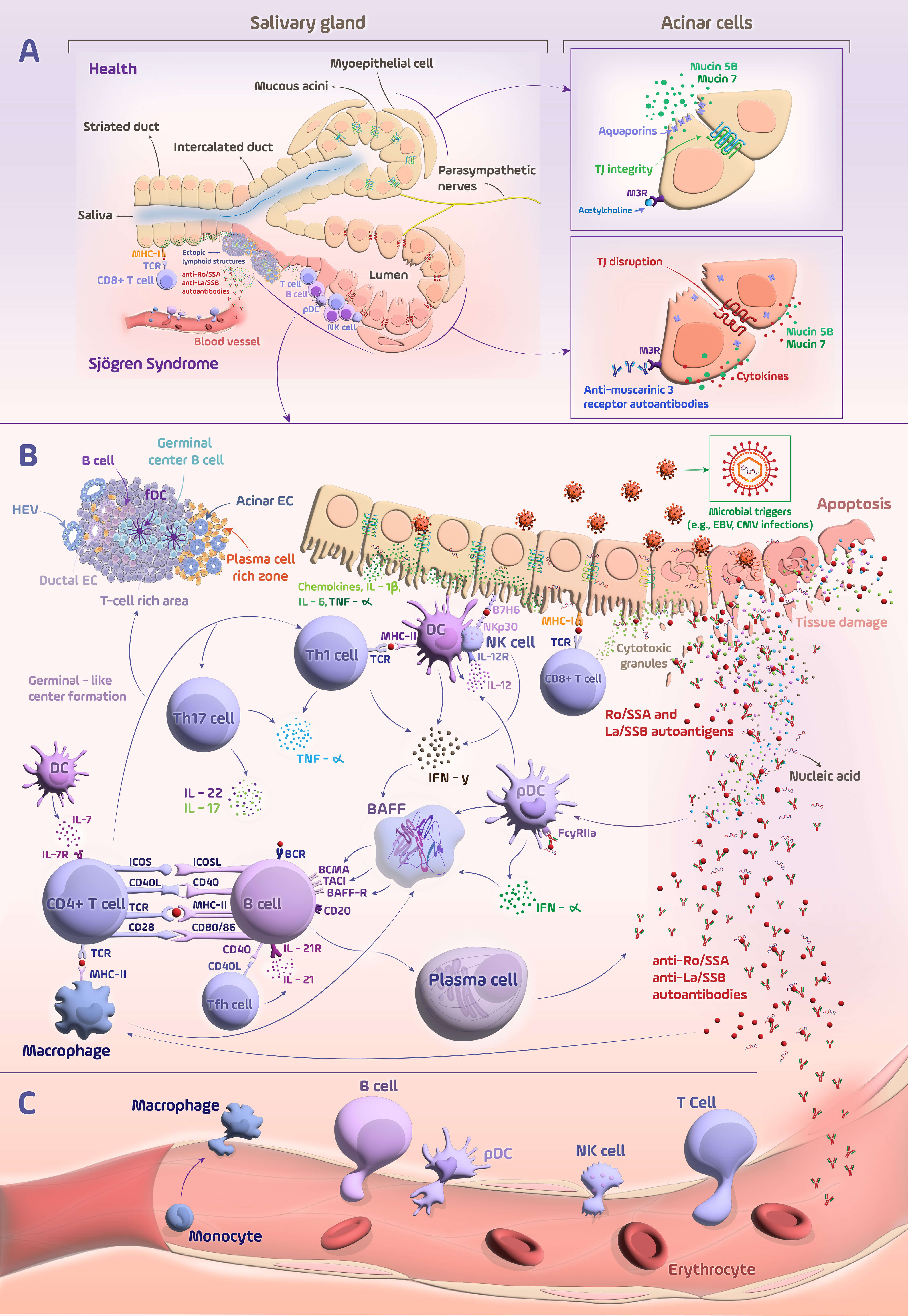 In the early stages of pSS, the salivary glands are primarily infiltrated by CD4+ T cells. As the condition becomes chronic, B cells become more prominent, forming clusters that resemble ectopic germinal centers (GCs). A key factor in the reduced saliva production and inflammation is dysfunction of the epithelial barrier, in particular, the tight junctions (TJs) and ion channels (Fig. 1A). The breakdown of this barrier exposes autoantigens, like Ro/SSA and La/SSB, which in turn drive a continuous autoimmune response [20, 21, 22].