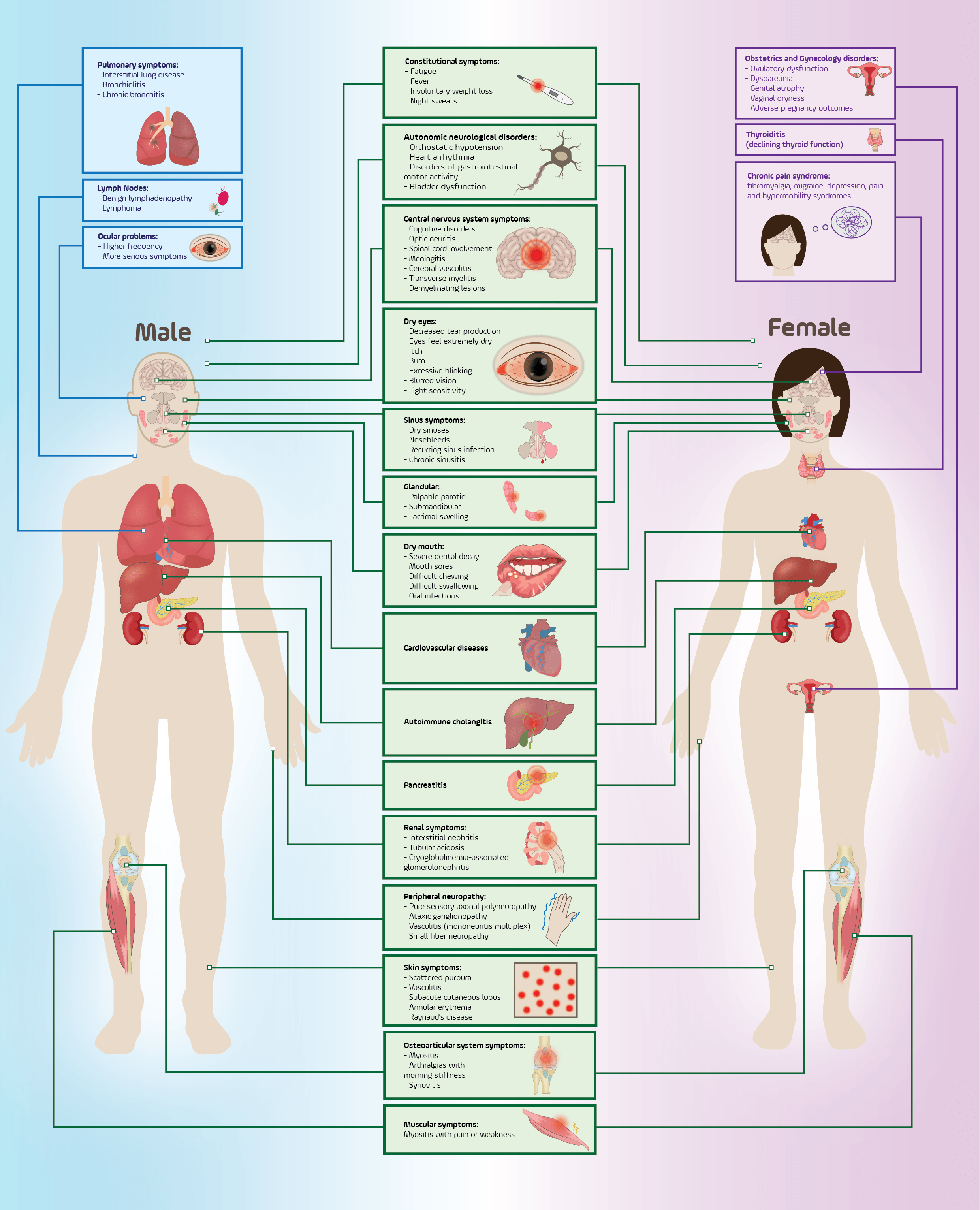 Sex-based differences and multisystem manifestations in primary Sjögren’s syndrome. The constitutional symptoms are common to both sexes and highlight organ-specific differences. Male patients more frequently develop pulmonary disease, lymphoma, and severe ocular involvement, whereas female patients more commonly present with thyroid dysfunction, chronic pain syndromes, and gynecological complications. Shared features include glandular dysfunction, neuropathies, renal involvement, and autoimmune-mediated systemic inflammation. This graphical work was created with Inkscape 1.4.2 (https://inkscape.org).