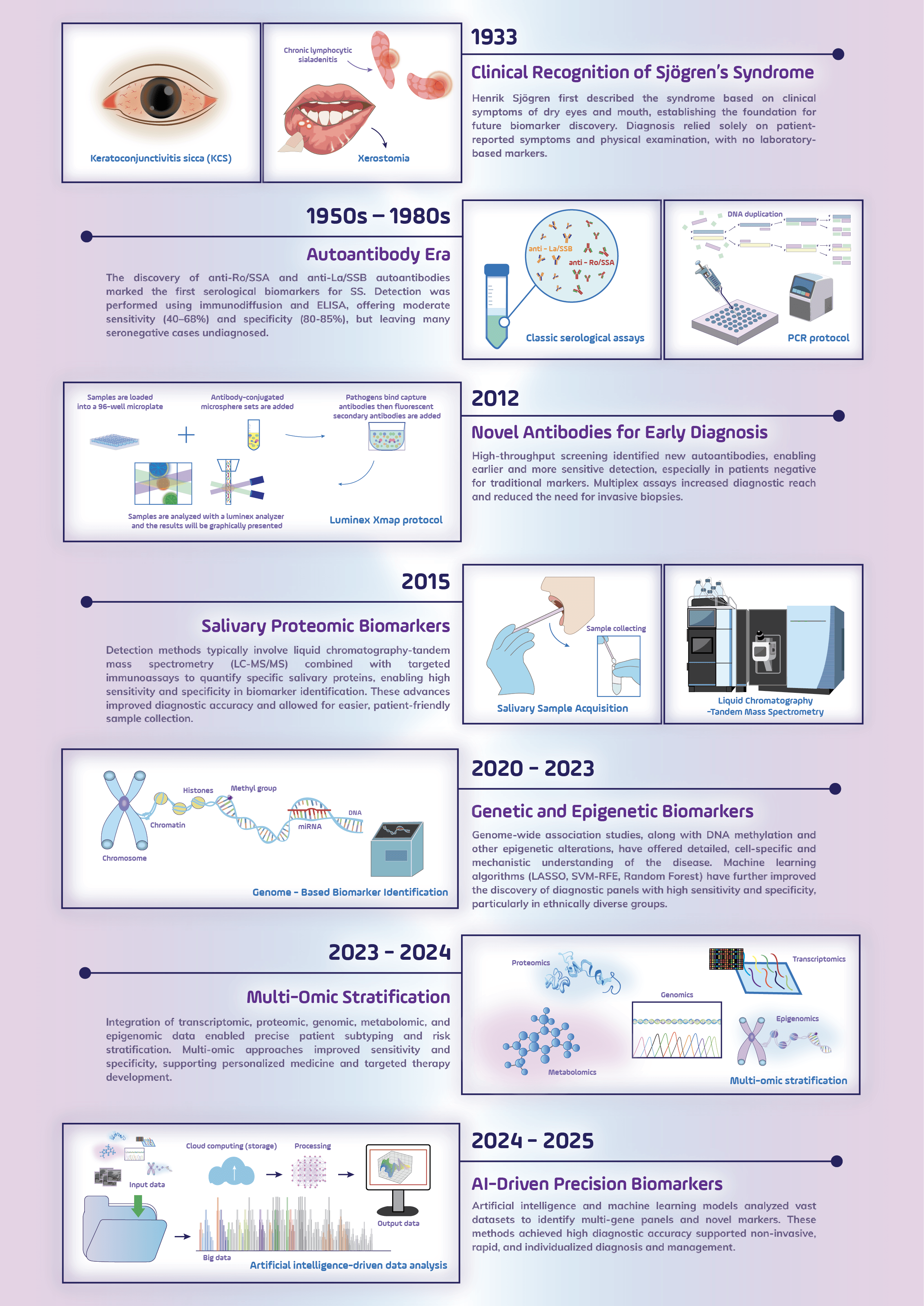 Currently, diagnosis of pSS relies on a combination of clinical features and objective criteria, such as those outlined in the 2016 classification system proposed by the American College of Rheumatology/European League Against Rheumatism (ACR/EULAR) [6, 7, 8]. These include evidence of autoimmunity, typically indicated by the presence of anti-Ro/SSA (Sjögren’s-syndrome-related antigen A) and anti-La/SSB (Sjögren’s-syndrome-related antigen B) autoantibodies, or positivity for rheumatoid factor (RF), as well as histopathological findings of focal lymphocytic sialadenitis (FLS) from a minor salivary gland biopsy. Although these criteria achieve high specificity (95%) and sensitivity (96%) [6], their application in routine clinical practice remains limited. Serologic markers are absent in approximately one-third of patients, and minor salivary gland biopsy, while informative, is invasive and subject to sampling variability [9, 10]. Moreover, sicca symptoms and other non-specific features, such as fatigue, arthralgia, and chronic cough, often overlap with numerous other conditions [11], leading to diagnostic delay or misclassification in many patients [12]. These challenges have driven an urgent need to identify novel, non-invasive, and more specific biomarkers for pSS. Traditional tools such as anti-SSA/SSB serologies and histopathology remain valuable, but are limited by low early sensitivity, lack of disease specificity, and procedural invasiveness [11]. Recent advances in molecular profiling and multi-omic technologies have opened new avenues for biomarker discovery. For example, autoantibodies that target salivary gland proteins expressed early in pSS, such as anti-salivary protein 1 (SP-1), anti-parotid secretory protein (PSP), and anti-carbonic anhydrase VI (CA6), have been found in early-stage or seronegative cases and may enhance diagnostic sensitivity [11]. In parallel, noninvasive sampling of saliva and tears has enabled “liquid biopsy”-based approaches, with cytokine profiling, transcriptomic signatures, and proteomic/metabolomic analyses revealing promising indicators of disease activity and subtype differentiation [13, 14].