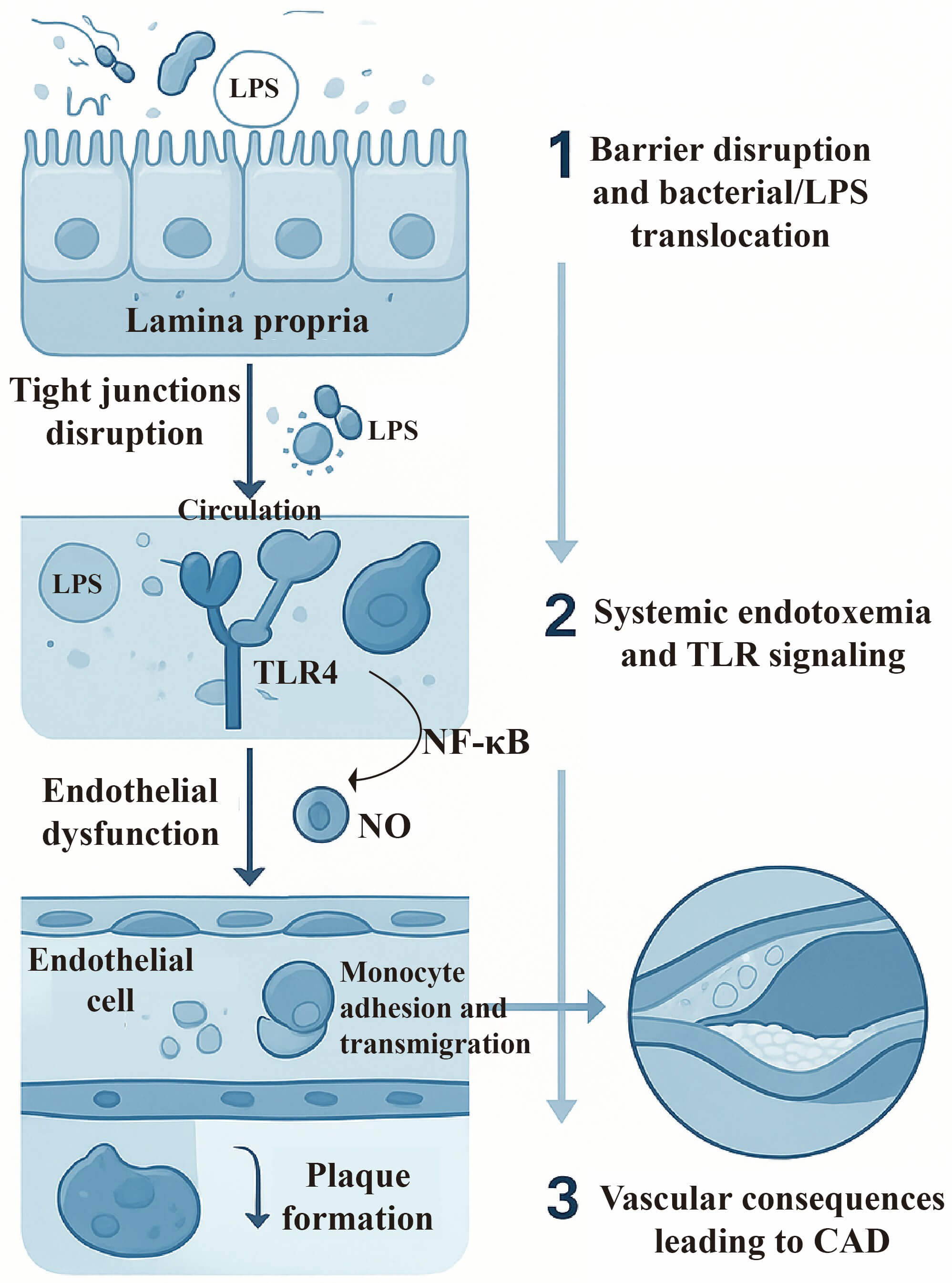 The intestinal barrier plays a crucial role in maintaining homeostasis and shielding the body from pathogenic invasion. Its functional integrity relies on the synergistic action of tight junctions in intestinal epithelial cells, mucosal secretions, and the immune system. When the intestinal barrier is damaged, such as by dietary factors high in fat and sugar, persistent stress, or improper use of antibiotics, the barrier permeability can significantly increase, inducing chronic low-level inflammation [57]. Increasing evidence suggests an elevated intestinal permeability in patients with CAD and atherosclerosis. Intriguingly, the presence of gut-derived bacteria has been reported in human atherosclerotic plaques, indicating a role of bacterial translocation in the pathogenesis of atherosclerosis [58, 59]. In the pathological process of CAD, this low-level chronic inflammation exhibits a significant impact. Inflammation leads to intestinal dysfunction, and the damaged intestinal barrier allows bacteria and their metabolites (such as lipopolysaccharide, LPS) from the intestinal lumen to enter the bloodstream, activating a systemic immune response. This process accelerates the formation of atherosclerosis and plaque instability by increasing the production of pro-inflammatory cytokines and affecting the recruitment of white blood cells (Fig. 2). These are the main characteristics of CAD development [60, 61, 62].