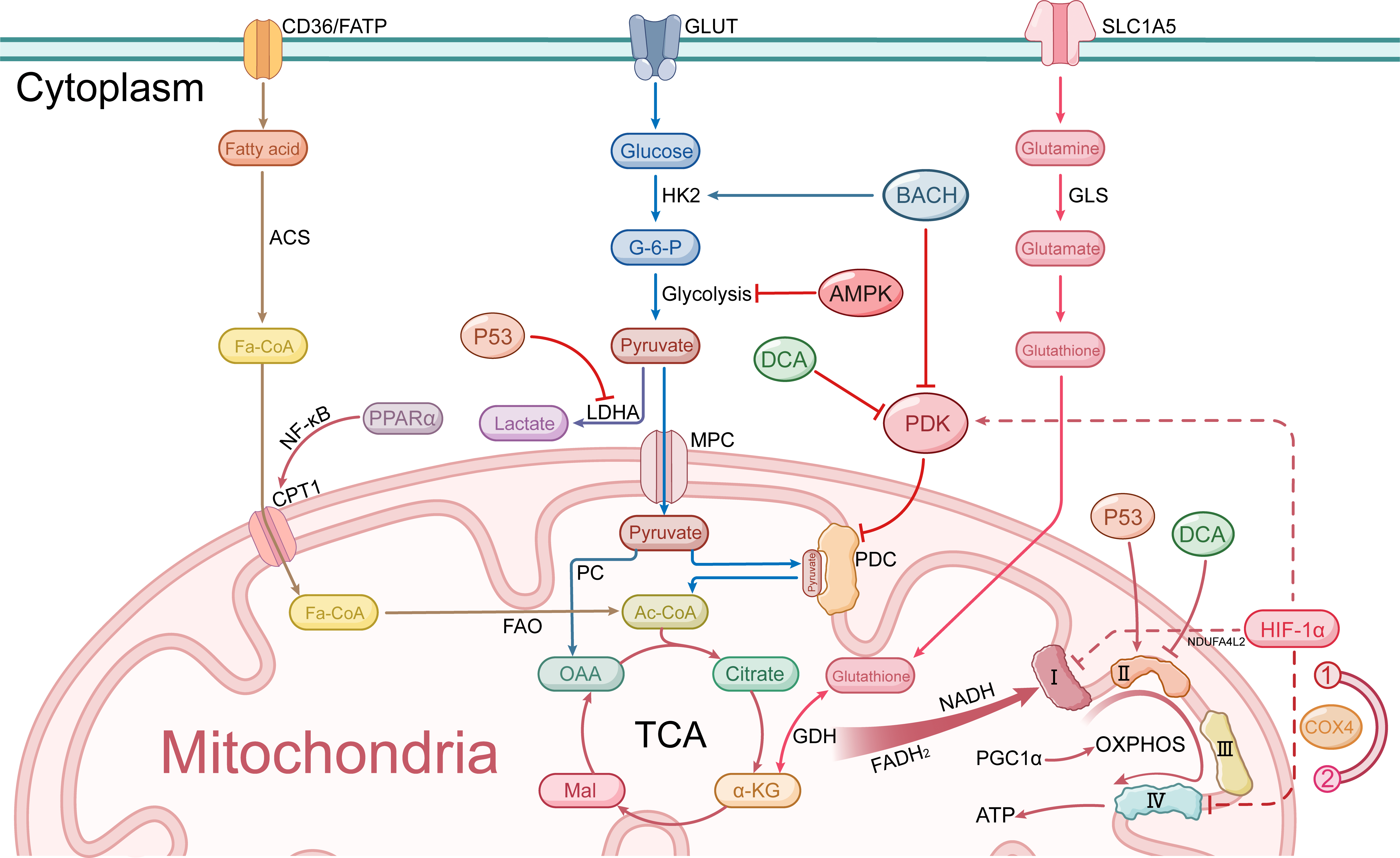 In recent years, considerable attention has been given to altering TCA cycle flux through the modulation of pyruvate metabolism. BTB domain and CNC homolog 1 (BACH1), a transcription factor that is highly expressed in breast tumors, inhibits pyruvate dehydrogenase (PDH) activity by transcriptionally activating pyruvate dehydrogenase kinase (PDK). This action limits the entry of pyruvate into mitochondria and enhances the Warburg effect [25]. Similarly, the therapeutic agent miR-211, which targets pyruvate metabolism, shifts the cellular phenotype toward a proglycolytic state by depleting PDK4, thereby increasing the susceptibility of cancer cells to mitochondrial respiratory inhibition [26]. In contrast, the modulation of AMPK activation leads to the phosphorylation of PDH, thereby restoring TCA cycle flux and promoting cancer metastasis by enabling cancer cells to adapt to metabolic and oxidative stress. These findings suggest a dual role for metabolic checkpoints in balancing biosynthetic and catabolic demands during metastasis [22] (Fig. 2). In chemotherapy-resistant cells, the TCA cycle is among the pathways that are most significantly upregulated, indicating that these cells have evolved a more pyruvate-dependent TCA cycle metabolic pathway, which is closely associated with reduced sensitivity to chemotherapy [17]. Targeting the TCA cycle may help overcome the mitochondrial adaptations observed in chemotherapy-persistent triple-negative breast cancer (TNBC), restoring sensitivity to therapeutic agents.