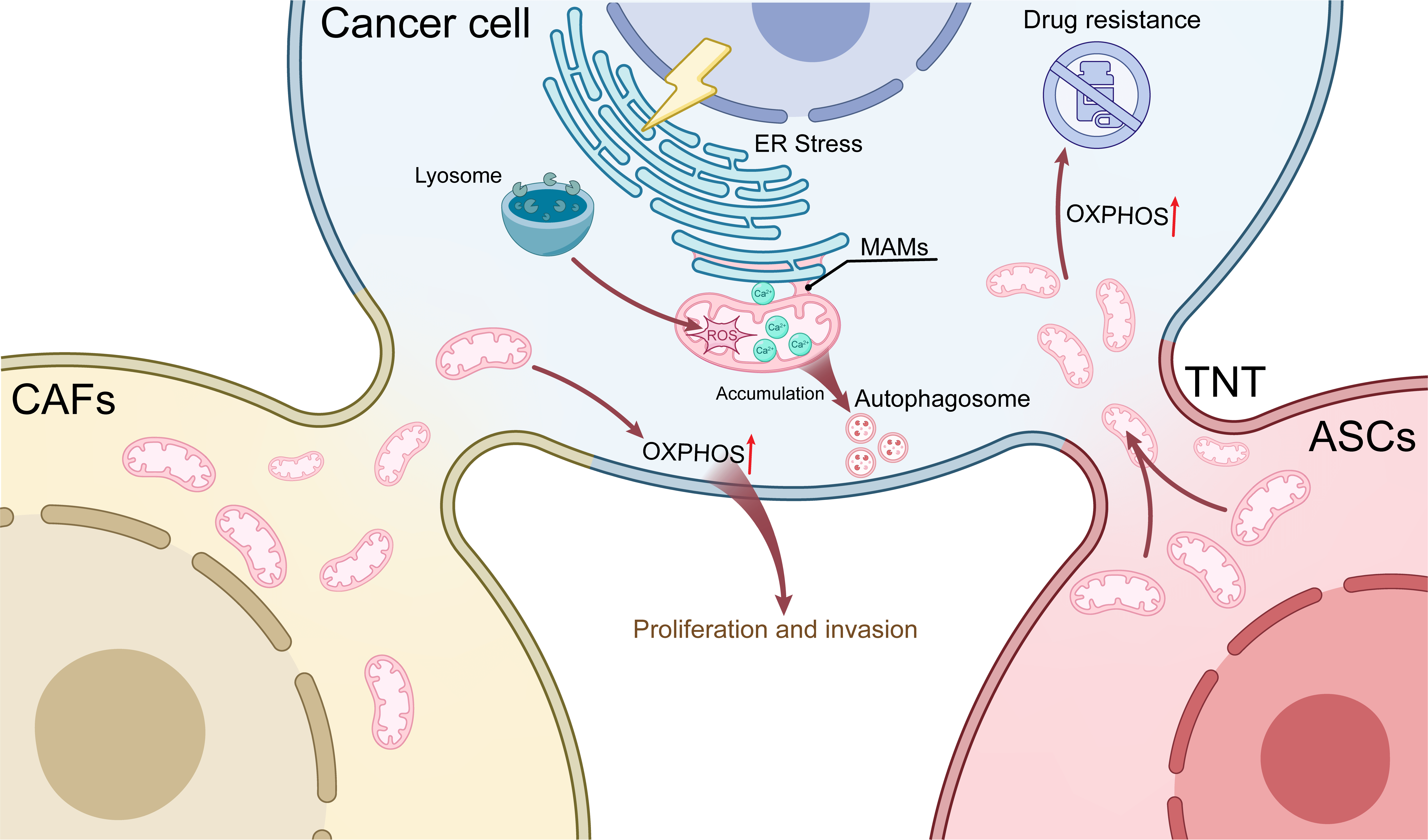 Network regulation of mitochondrial metabolism. Mitochondria interact with key organelles such as lysosomes and the endoplasmic reticulum to influence malignant features. Additionally, breast cancer cells acquire functional mitochondria from CAFs and ASCs via TNTs, thereby enhancing their metabolic fitness and invasive potential, upregulating OXPHOS, and promoting therapy resistance. Red upward arrow: Increased OXPHOS activity. TNT, tunneling nanotube; CAFs, cancer-associated fibroblasts; ASCs, adipose-derived stem cells; MAMs, mitochondria-associated endoplasmic reticulum membranes; ER, endoplasmic reticulum; OXPHOS, oxidative phosphorylation.