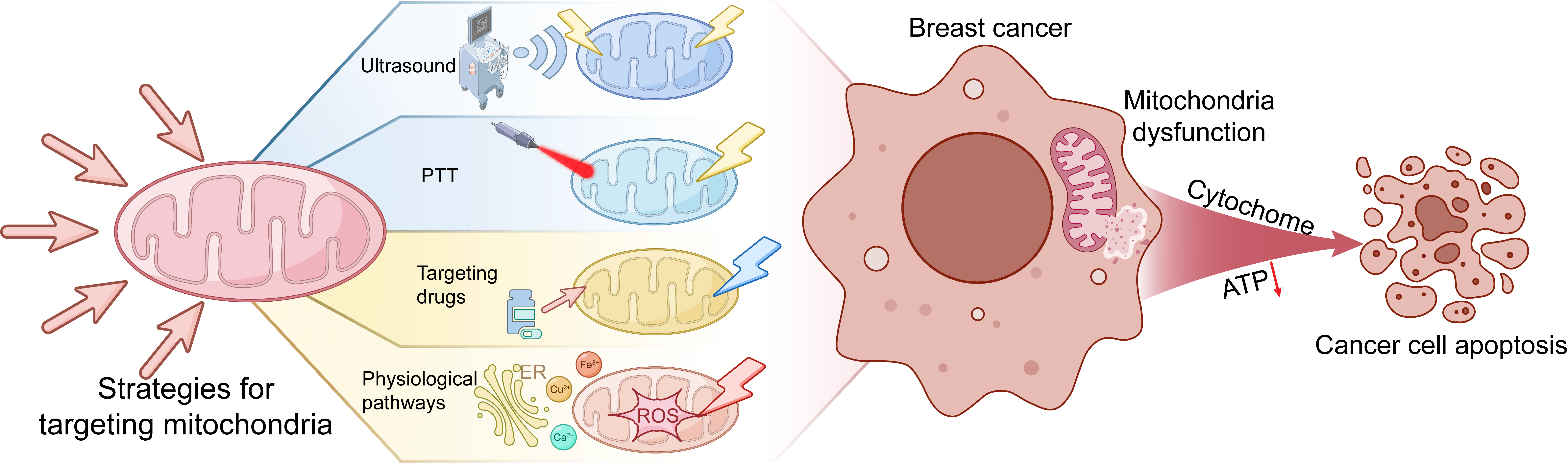 In recent years, targeted mitochondrial therapy has emerged as a prominent cancer treatment approach because of its high specificity, favorable therapeutic outcomes, and minimal adverse effects. Mitochondria contain multiple therapeutic targets, including the MPTP, various ionic components, ROS, and mitochondrial dynamics. These critical components are closely associated with metabolic dysregulation in breast cancer cells, making them effective targets for cancer intervention through the induction of mitochondrial dysfunction. Therefore, the development of precise therapeutic strategies that target these mitochondrial components can optimize treatment efficacy while maintaining cellular homeostasis.